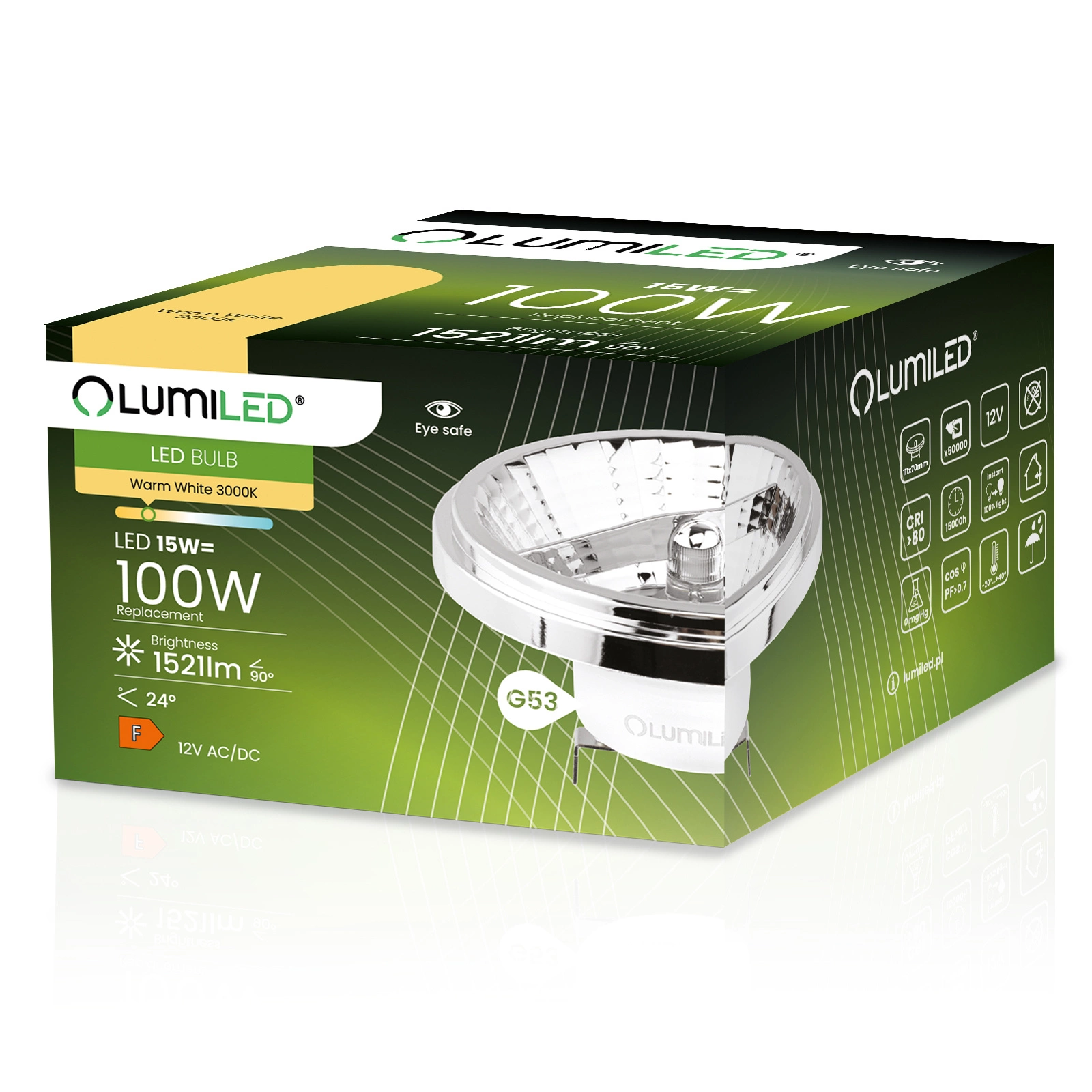 10x Żarówka LED G53 Reflektor AR111 15W = 100W 1521lm 3000K Ciepła 24° 12V Srebrna LUMILED