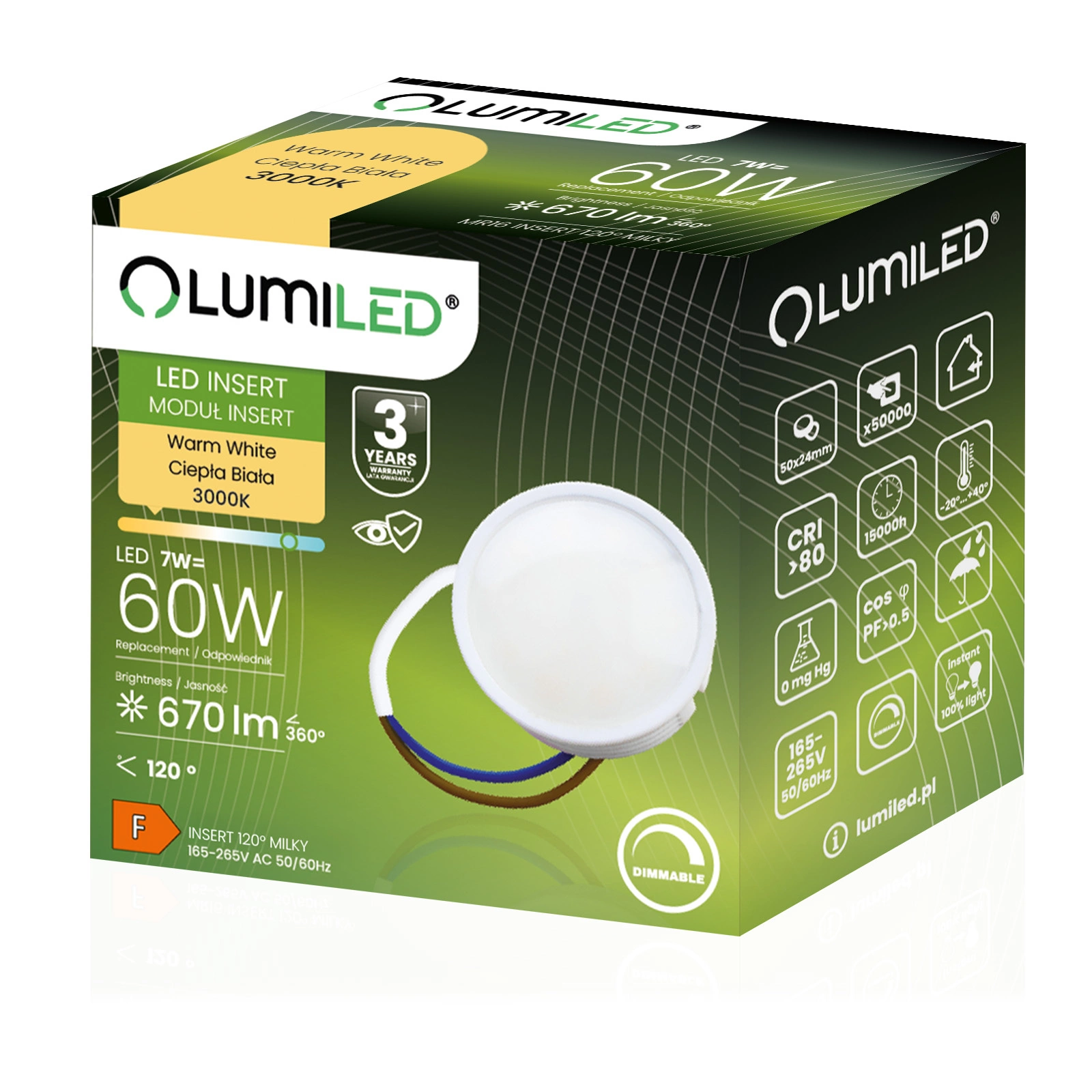 10x Wkład do Opraw LED Żarówka Moduł INSERT Reflektor 7W = 60W 670lm 3000K Ciepła 120° Ściemnialna LUMILED