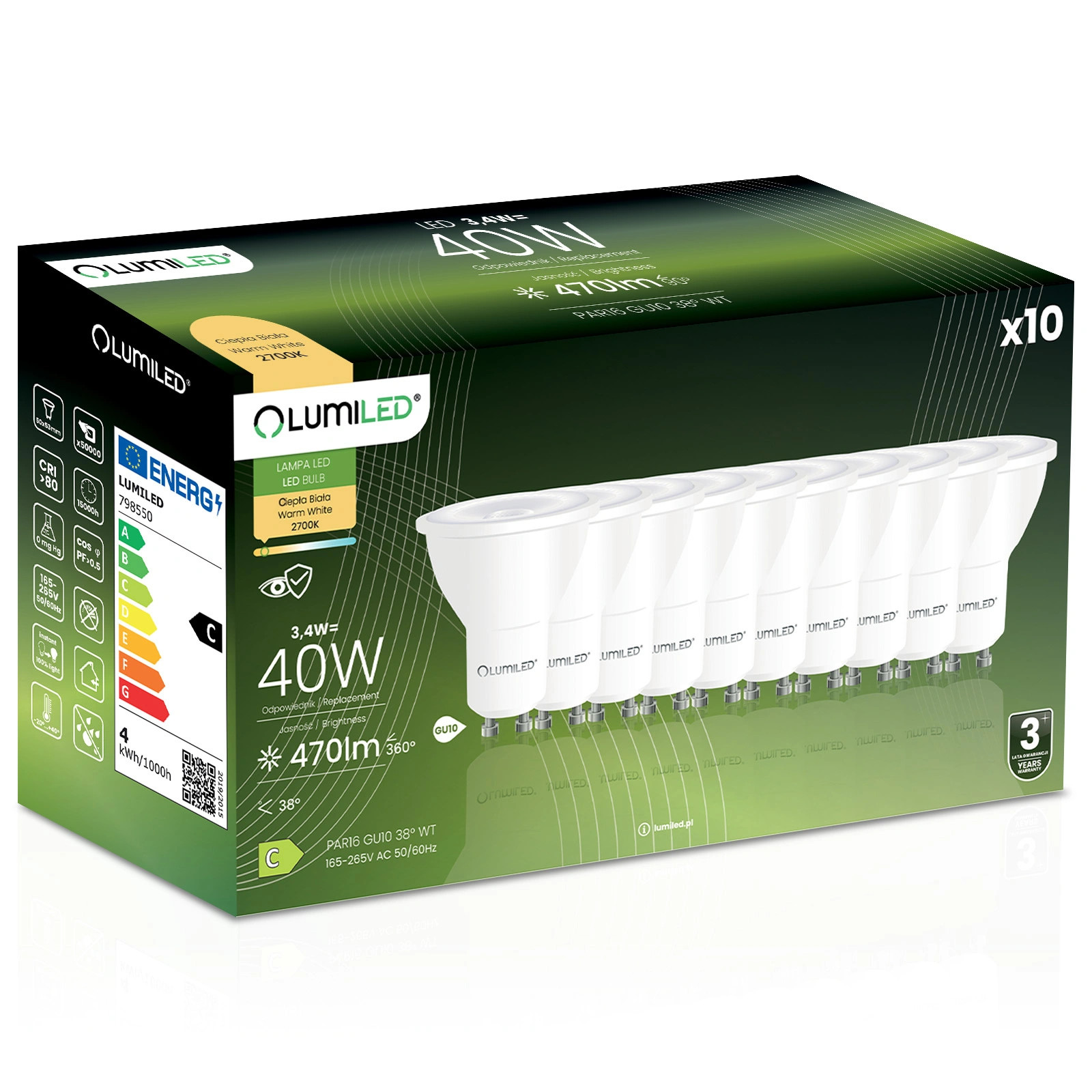 10x Żarówka LED GU10 Reflektor PAR16 3,4W = 40W 470LM 2700K Ciepła 38° LUMILED - trzecia cecha produktu