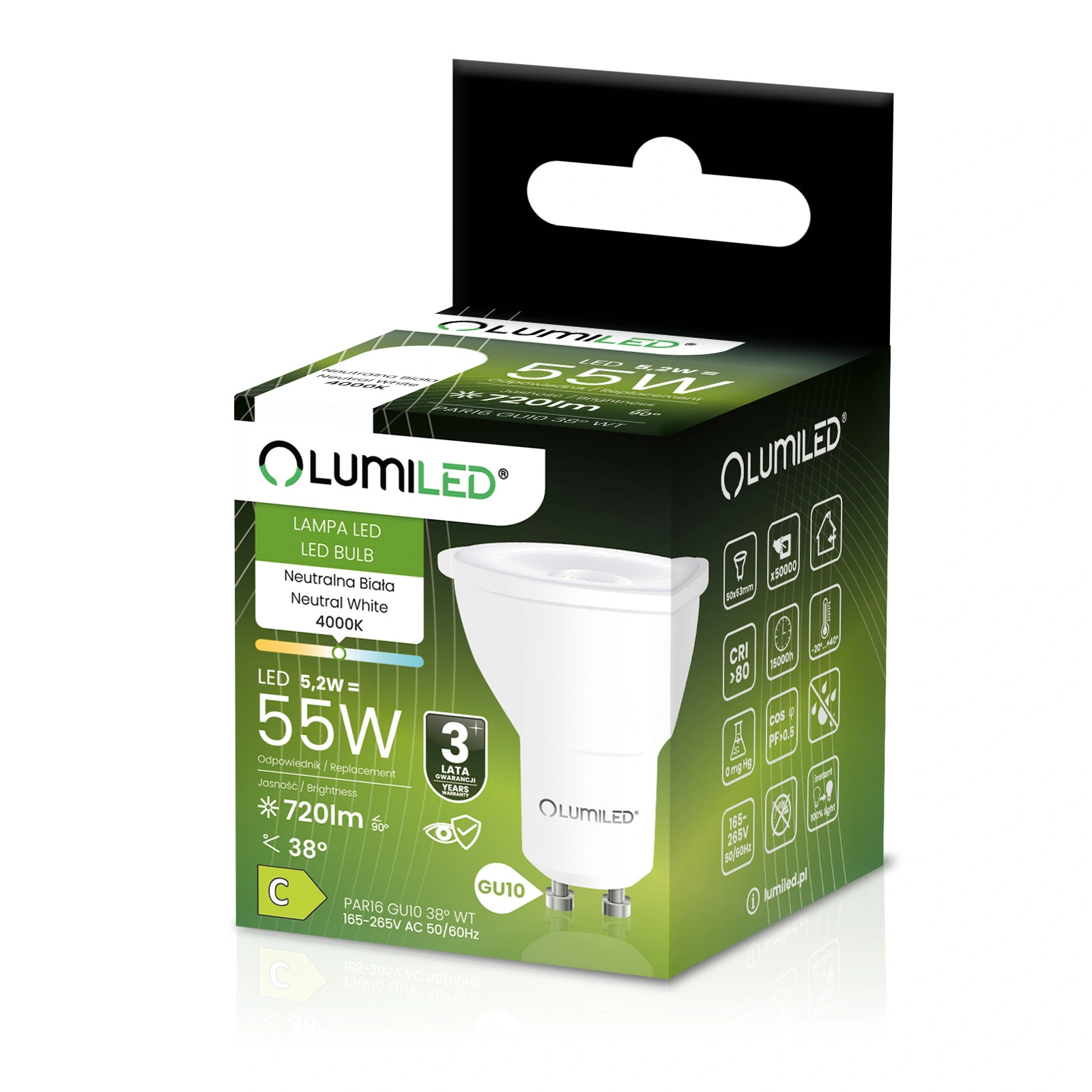 10x Żarówka LED GU10 Reflektor PAR16 5,2W = 55W 720LM 4000K Neutralna 38° LUMILED