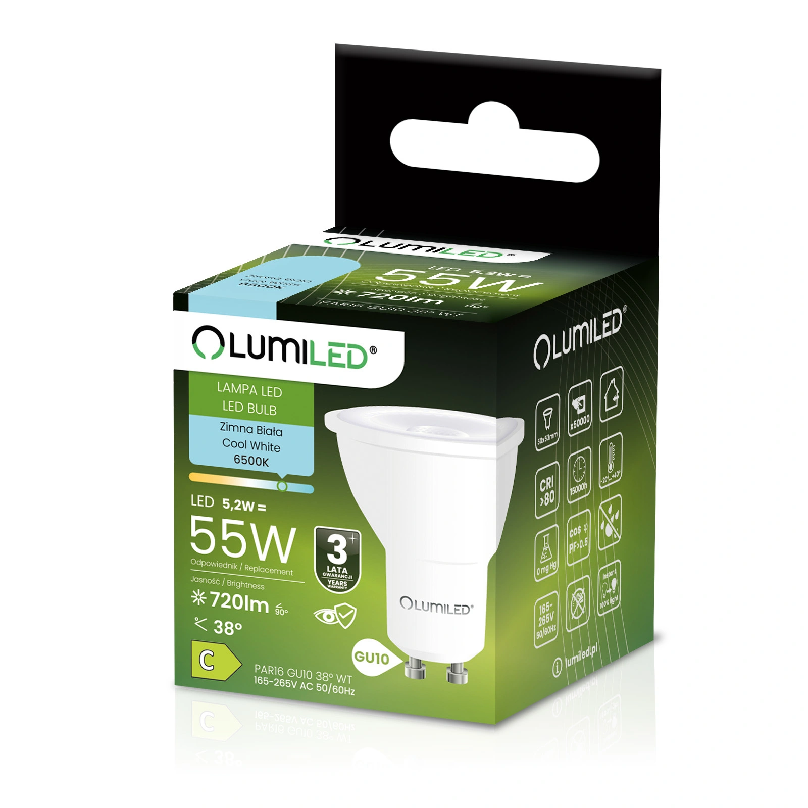 10x Żarówka LED GU10 Reflektor PAR16 5,2W = 55W 720LM 6500K Zimna 38° LUMILED - pierwsza cecha produktu