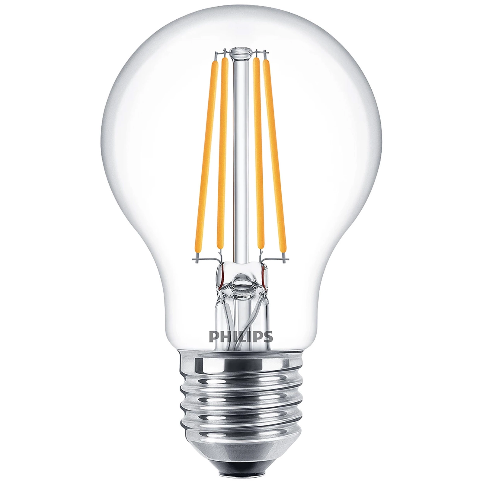 Żarówka LED marki PHILIPS 7W, do używania na co dzień w pomieszczeniach. Znajome kształty, które kochasz. Zużywają około 85% mniej energii niż tradycyjne żarówki dzięki najnowszej technologii energooszczędnej LED i mają dziesięć razy dłuższy okres użytkowania. Żarówka filamentowa standardowa z przezroczystego szkła, z gwintem E27, 15 000 godzin eksploatacji i strumień światła o wartości 806 lumenów. Moc lampy odpowiada światłu żarówki 60W.