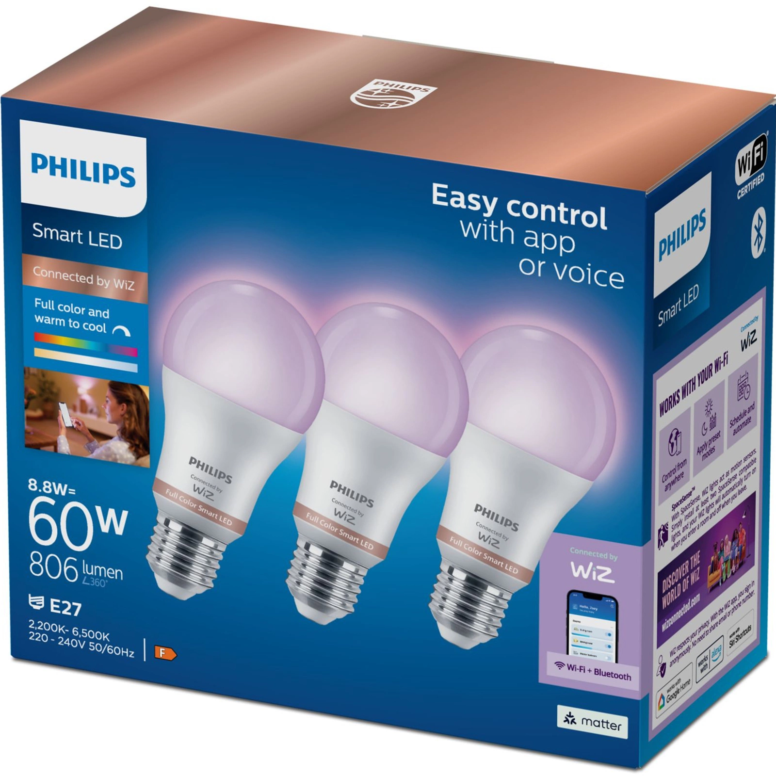 3x Żarówka LED E27 A60 8.8W = 60W 806lm 2200-6500K RGB + TW Inteligentna SMART WiFi Bluetooth Aplikacja WiZ Philips