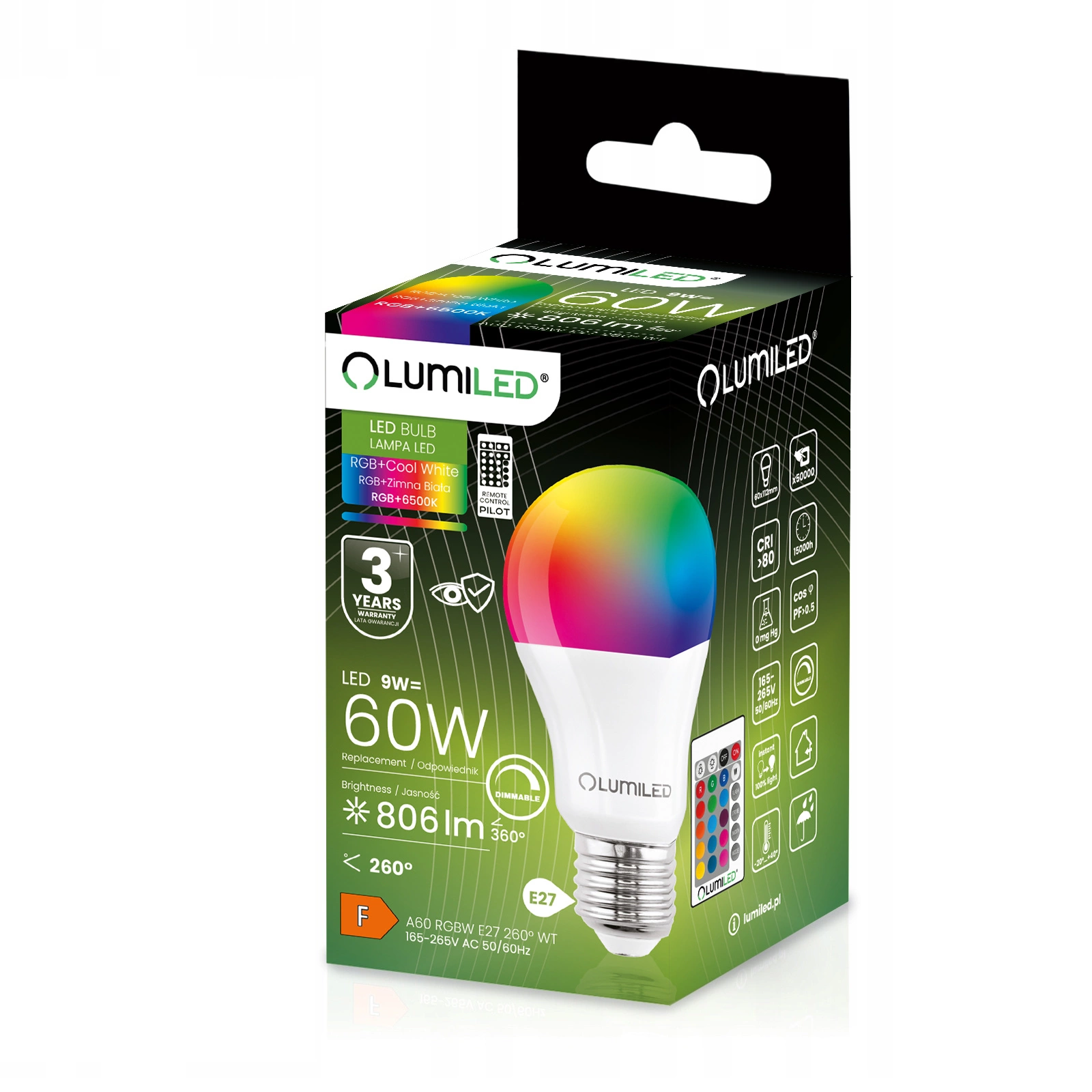 3x Żarówka LED E27 A60 9W = 60W 806lm 6500K + RGB Wielokolorowa 260° Ściemnialna Pilot LUMILED