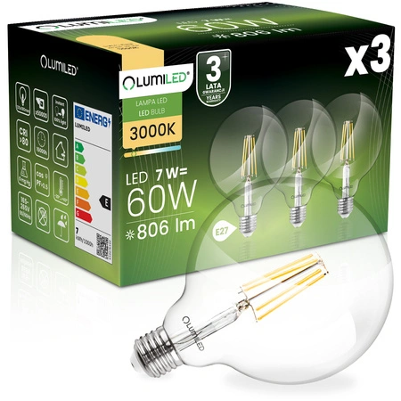 3x Żarówka LED E27 Kula G125 7W = 60W 806lm 3000K Ciepła 360° FILAMENT LUMILED - trzecia cecha produktu