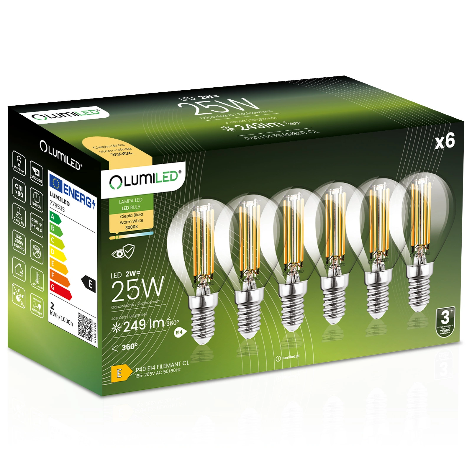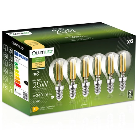 6x Żarówka LED E14 Kulka P45 2W = 25W 249lm 3000K Ciepła 360° FILAMENT LUMILED - pierwsza cecha produktu