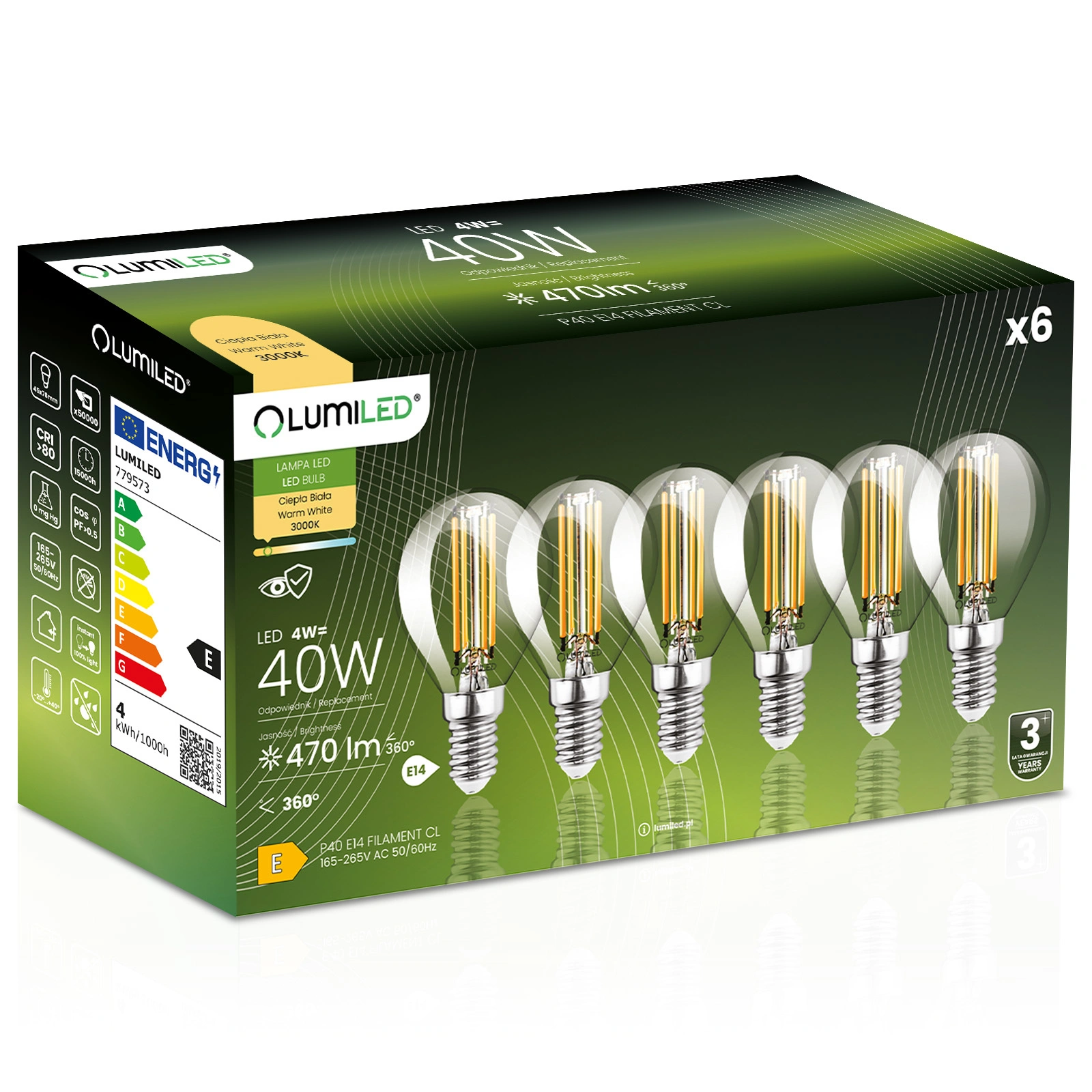 Zestaw 6x Żarówka LED LUMILED z gwintem E14 i mocą 4W to energooszczędny zamiennik 40W. Emituje 470 lumenów ciepłego światła 3000K, tworząc przyjemną atmosferę. Kąt 360° zapewnia równomierne rozproszenie światła w pomieszczeniu. Żywotność do 15 000 godzin i zakres pracy 165–265V gwarantują niezawodność i długie użytkowanie. Idealny wybór dla osób ceniących oszczędność energii i ekologię.