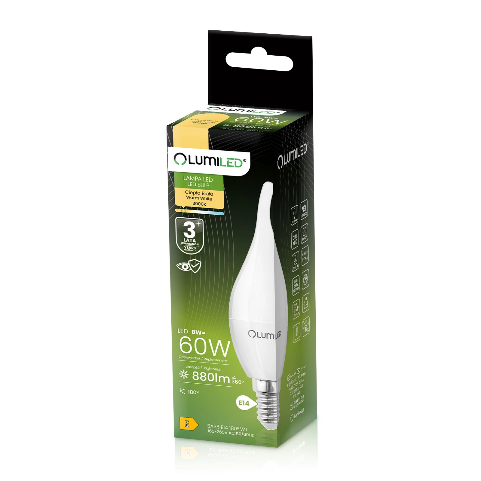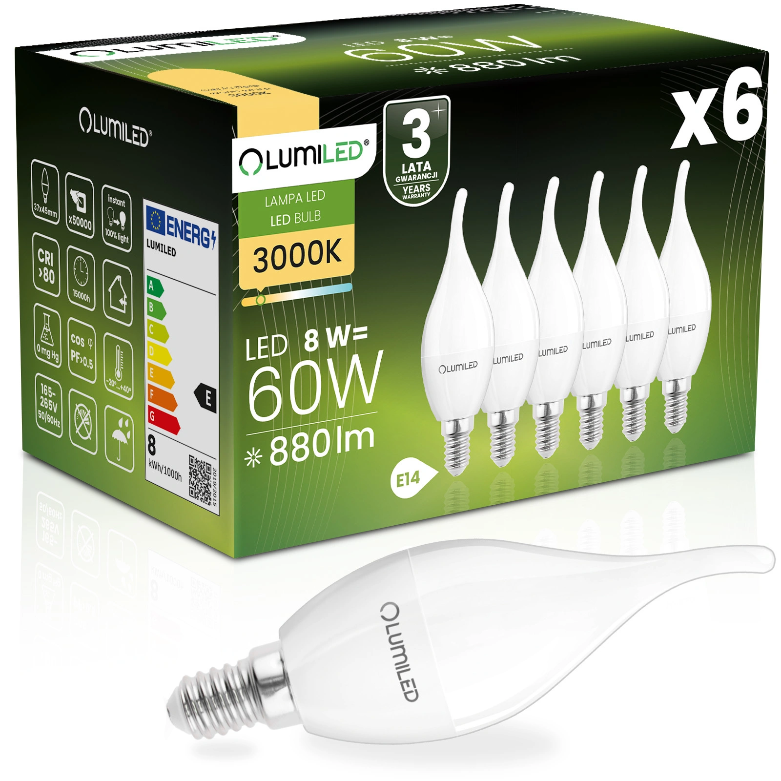 6x Żarówka LED E14 Świeczka BA35 8W = 60W 880lm 3000K Ciepła 180° LUMILED
