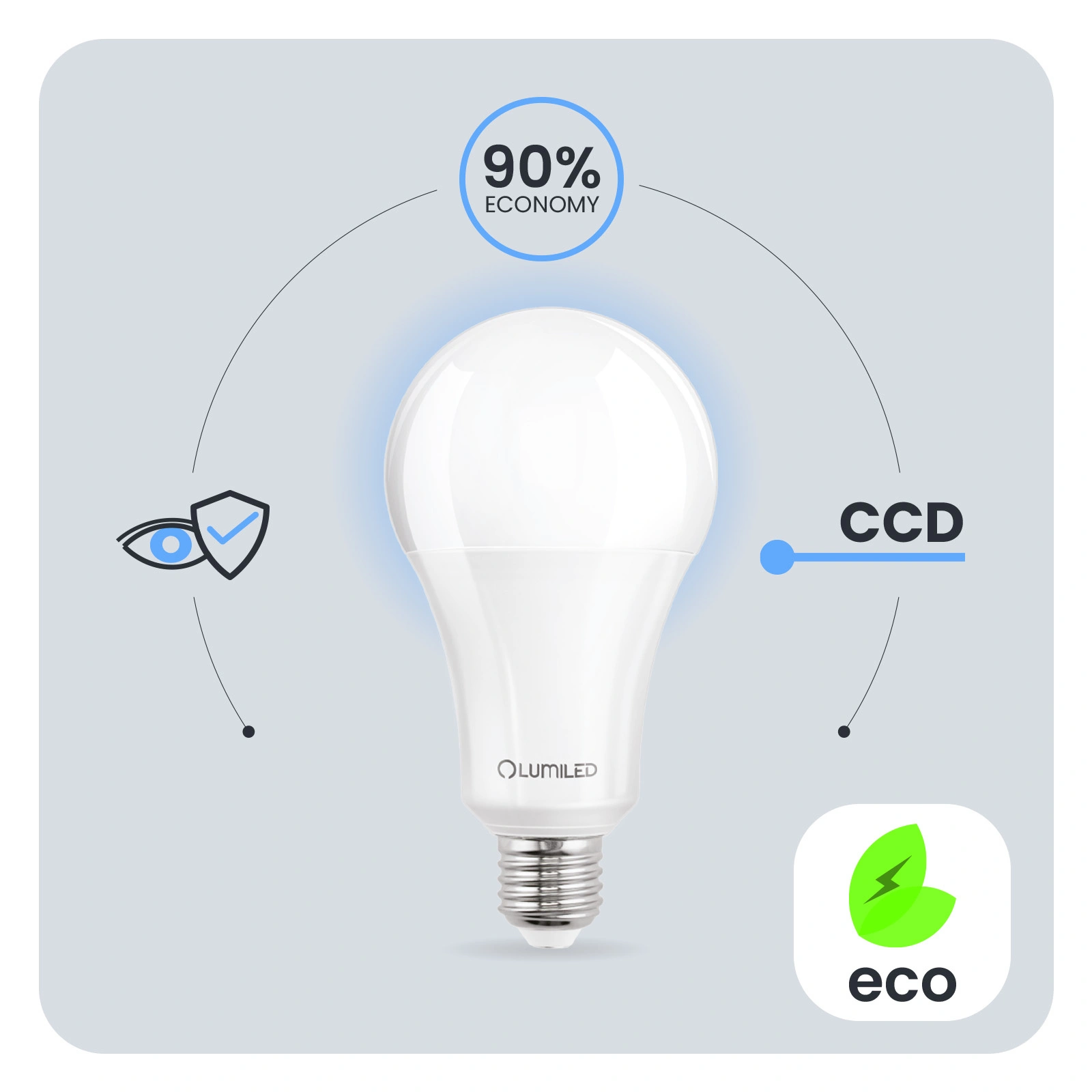 Zastosowana przetwornica CCD w żarówce LED sprawia, że żarówka jest odporna na spadki i wzrosty napięcia w sieci. Światło nie migocze, ani nie drży. Przetwornica CCD sprawia, że żarówka jest bezawaryjna przez długi czas. Żarówki LUMILED zaprojektowane zostały z myślą o jej użytkownikach. Słaba jakość oświetlenia może prowadzić do zmęczenia oczu dlatego nasze Żarówki posiadają opracowanie techniczne Eye Safe zapewnią komfortowe i przyjazne oświetlenie twoim oczom w każdym pomieszczeniu.