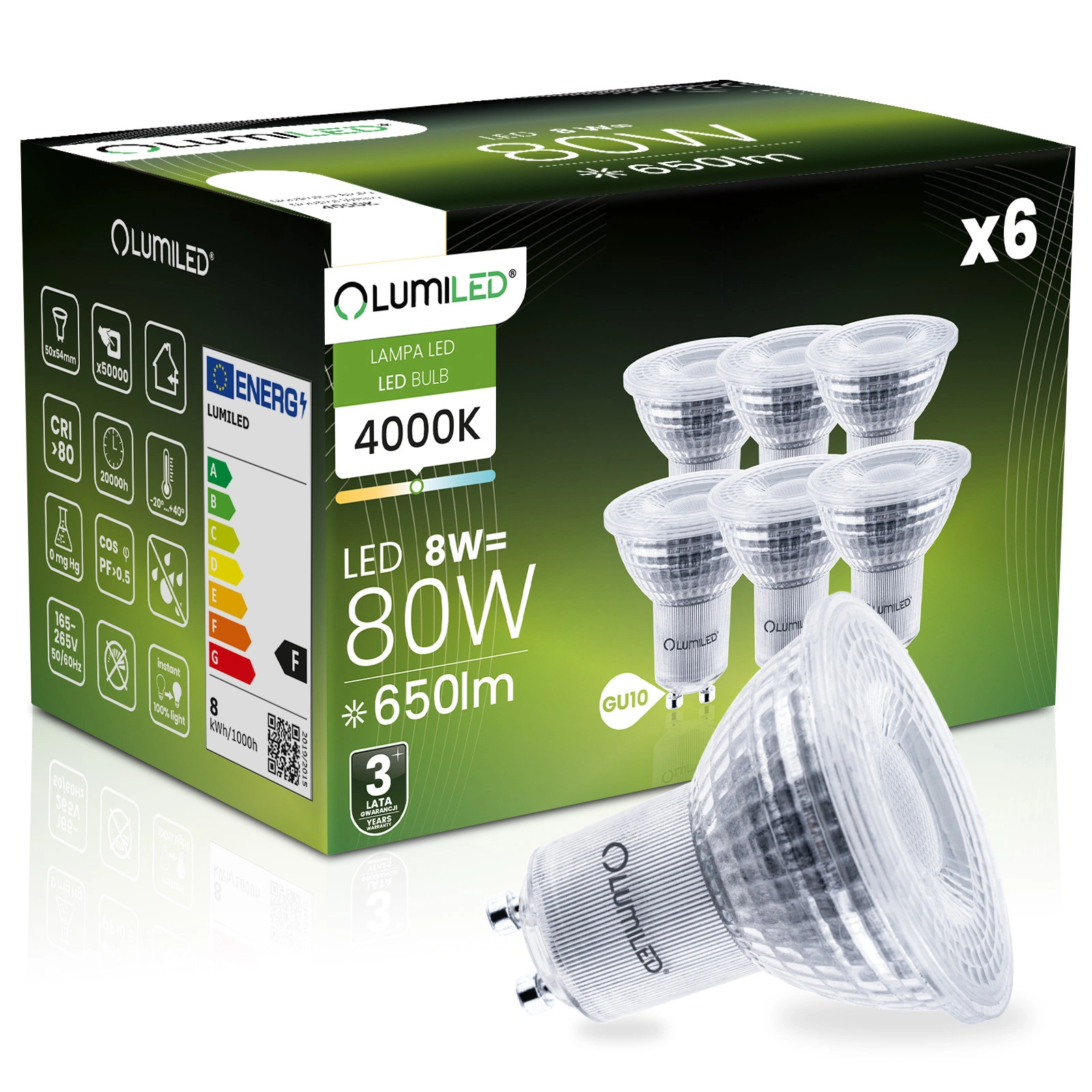 Zestaw 6x Żarówka LED renomowanej marki LUMILED z trzonkiem GU10 i mocy 8W to doskonały zamiennik tradycyjnych żarówek o mocy 80W, oferując przy tym oszczędność energii oraz dłuższą żywotność. Emituje światło o strumieniu świetlnym 650 lumenów i neutralnej barwie 4000K co sprawia, że idealnie nadaje się do oświetlenia wnętrz, gdzie wymagana jest jasna i naturalna barwa światła. Kąt świecenia wynoszący 36° pozwala na wąskie rozproszenie światła, skutecznie akcentując oświetlane przedmioty. Dzięki wysokiej jakości wykonania, ma żywotność aż 15 000 godzin, co przekłada się na wieloletnie użytkowanie. Dodatkowo pracuje w szerokim zakresie napięcia 165-265V i jest przystosowana do użytkowania w temperaturach otoczenia od -20°C do +40°C. Idealny wybór dla osób ceniących oszczędność energii oraz dbałość o środowisko.