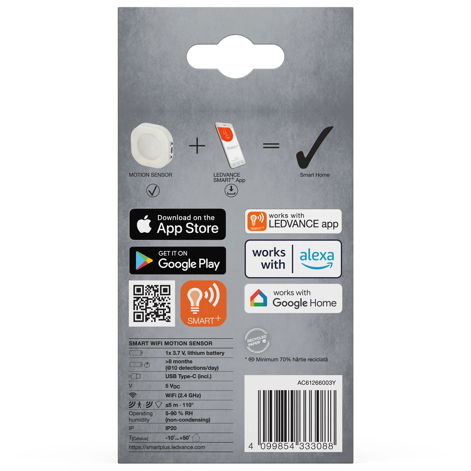 Czujnik ruchu SMART+ WiFi Motion Sensor to inteligentne urządzenie firmy LEDVANCE , które umożliwia łatwe sterowanie i automatyzację kompatybilnych urządzeń SMART+ WiFi na podstawie wykrytego ruchu. Po wykryciu ruchu użytkownik otrzymuje powiadomienie, a czujnik monitoruje historię wykrytych zdarzeń.