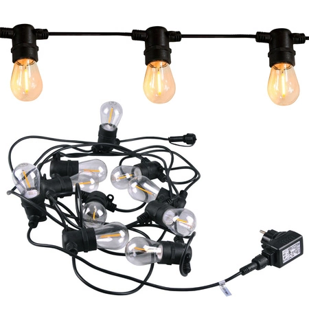 GIRLANDA OGRODOWA uznanej na rynku marki POLUX to sznur z 10 ozdobnymi żarówkami na gwint E27 typu LED filament S14 który pięknie prezentuje się w ogrodzie lub altanie dzięki ciepłemu światłu 2200K. Odpowiednie rozstawienie świateł w prezentowanej GIRLANDZIE OŚWIETLENIOWEJ świetnie sprawdzi się podczas wieczornych imprez plenerowych jak i na co dzień podczas spokojnych wieczorów spędzanych na tarasie. Materiały wykorzystane do produkcji girlandy zapewniają odporność na wnikanie wilgoci wynosi IP44. Każde gniazdo girlandy wyposażone jest w solidne uszczelnienie. Decydując się na zakup GIRLANDY OGRODOWEJ otrzymujemy produk wysokiej klasy, który zaspokoi potrzeby każdego klienta.