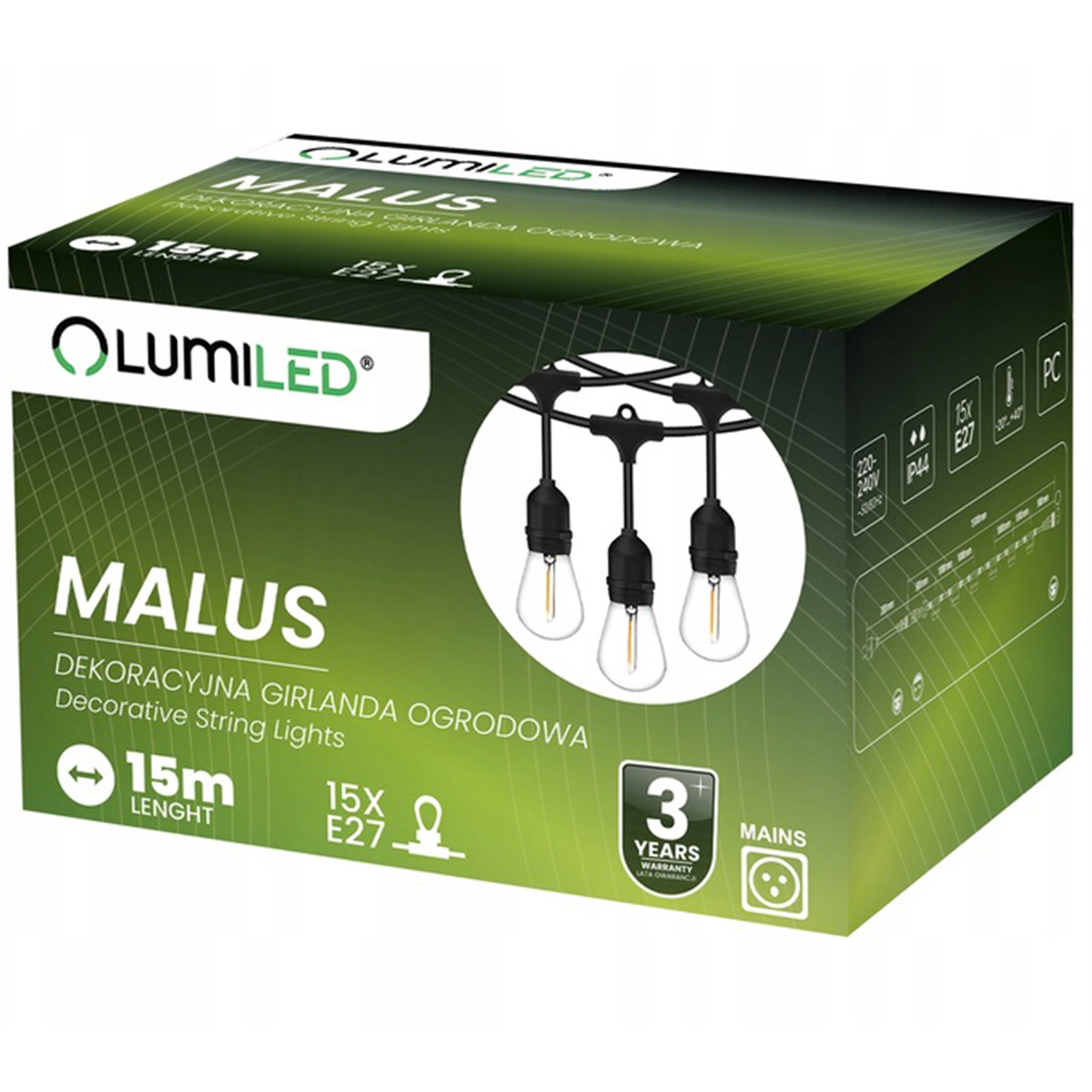 LUMILED MALUS to dekoracyjna girlanda ogrodowa o długości 15 metrów, wyposażona w 15 gniazd E27 oraz komplet 15 żarówek LED 1,3W 2200K. Dzięki gotowemu zestawowi od razu stworzysz wyjątkową atmosferę w ogrodzie, na tarasie lub podczas spotkań na świeżym powietrzu. Dopasowane źródła światła gwarantują ciepłą, nastrojową barwę i równomierne oświetlenie, które sprawdzi się zarówno na co dzień, jak i podczas wyjątkowych okazji. To nie tylko praktyczne i kompletne rozwiązanie, ale również stylowa dekoracja, która odmienia każdą przestrzeń.
