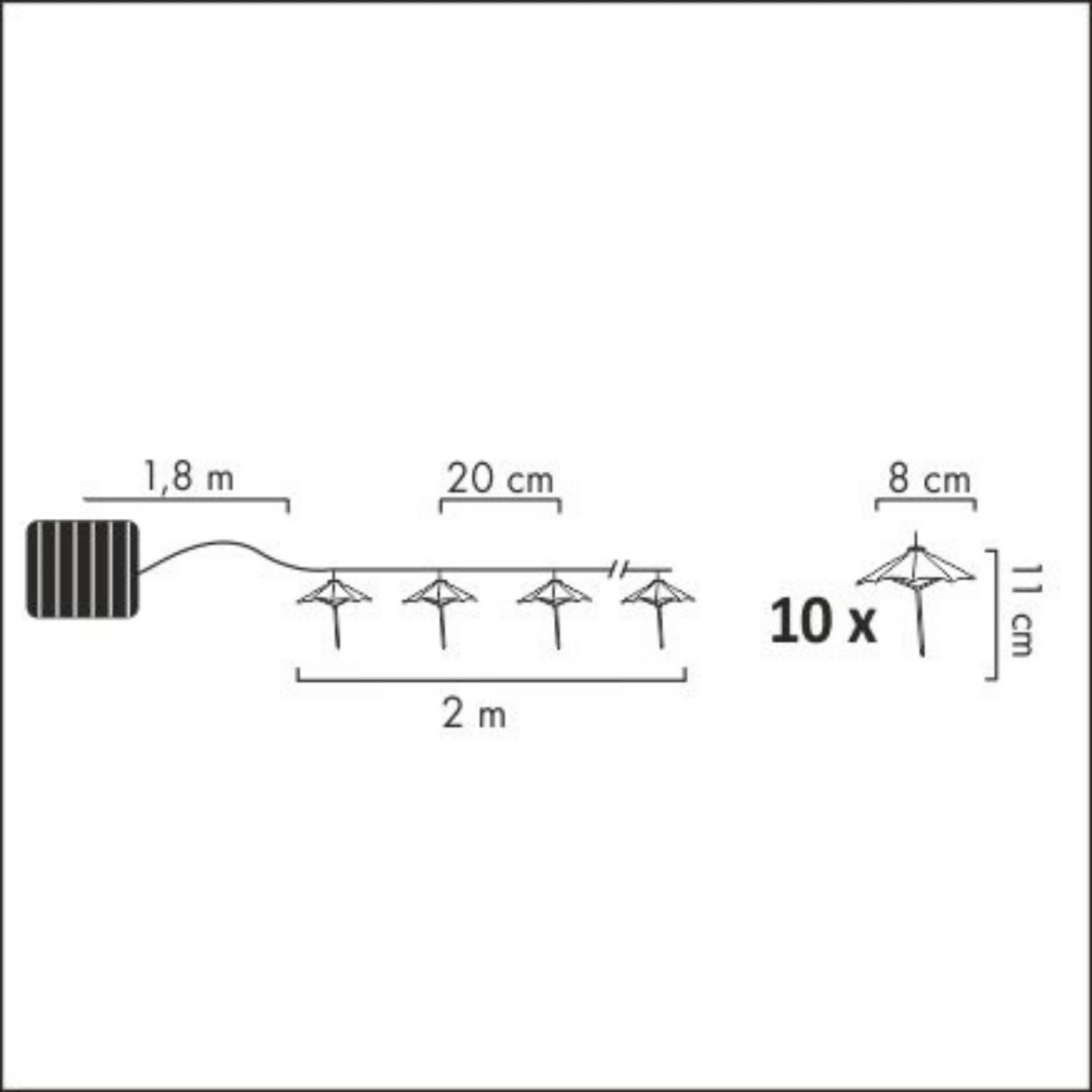 Girlanda solarna z 10-ma kolorowymi parasolkami marki POLUX, sprawdzi się jako dekoracyjne i praktyczne oświetlenie Twojego ogrodu. Oryginalny kształt oprawek solarnych, świetnie podkreśli towarzystwo większych roślin zielonych.