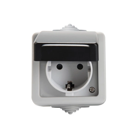 Gniazdko Schuko w kolorze szarym z ochroną styków, przeznaczone do użytku biurowego. Obsługuje 16A i zapewnia bezpieczne połączenie urządzeń w codziennym użytkowaniu.