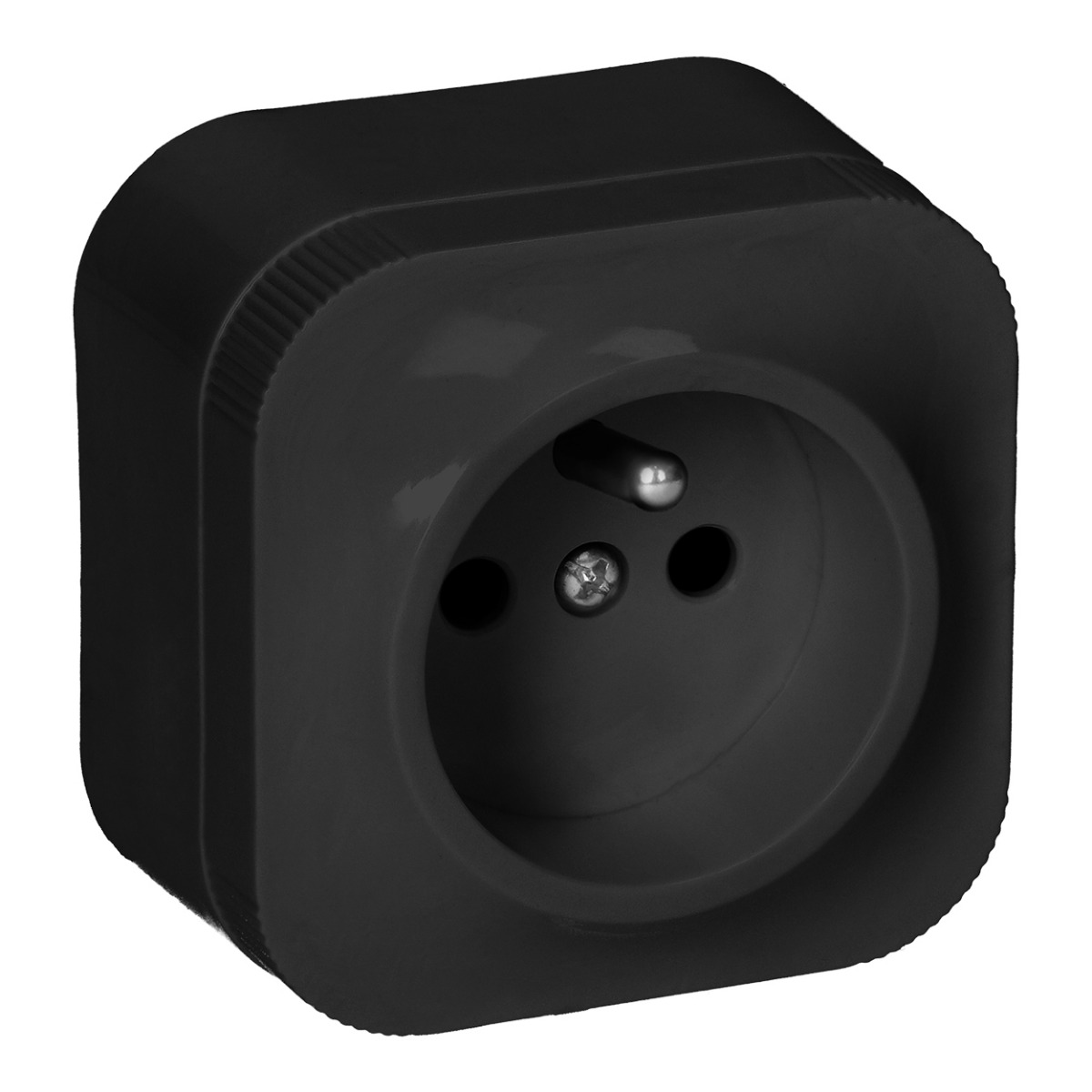 Gniazdo pojedyncze z uziemieniem na bolec (typu E) z zaokrąglonymi krawędziami w kolorze czarnym, do montażu natynkowego.
