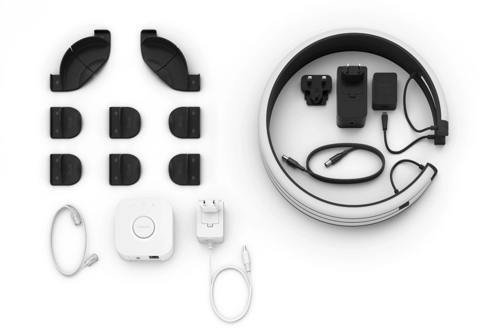 Zestaw zawiera nie tylko taśmę Philips Hue Play Gradient PC, ale także mostek Hue Bridge, który jest niezbędny do pełnego działania systemu. Dzięki temu otrzymujesz kompletny pakiet, gotowy do instalacji i natychmiastowego korzystania ze wszystkich inteligentnych funkcji – od synchronizacji światła z obrazem po tworzenie scen i harmonogramów.