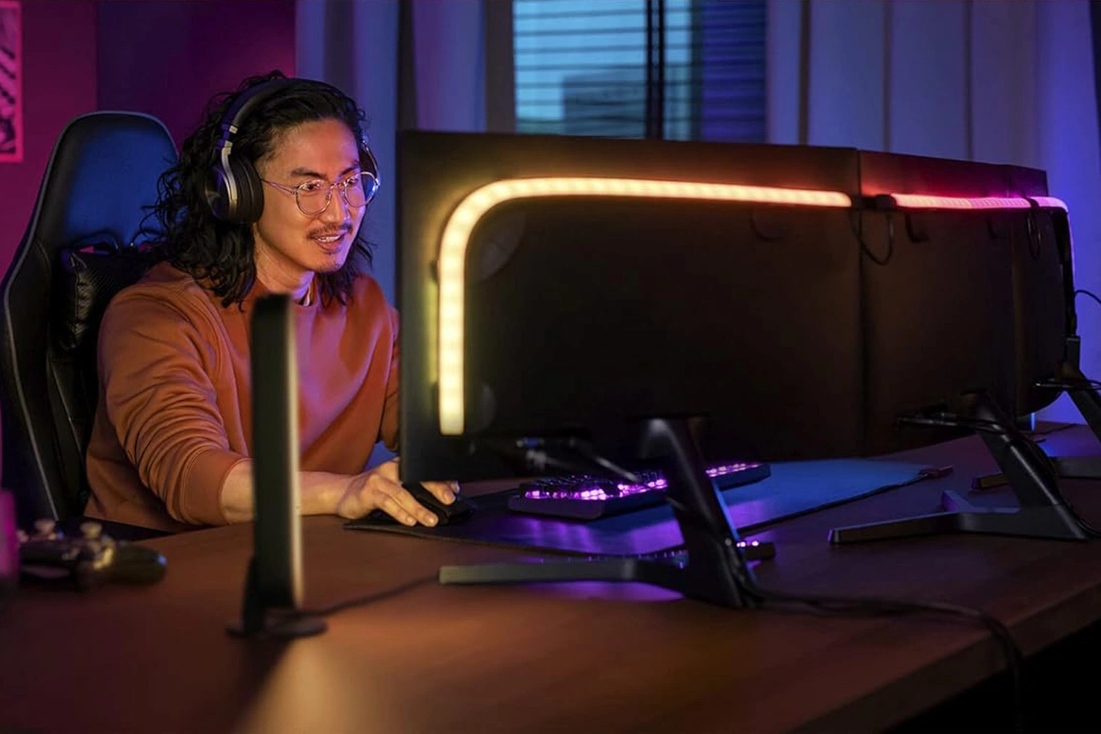 Seria Philips Hue Play Gradient PC została zaprojektowana specjalnie do konfiguracji z jednym lub trzema monitorami. Elastyczna konstrukcja taśmy pozwala ją łatwo zginać na narożnikach, dzięki czemu idealnie dopasowuje się do krawędzi ekranu i zapewnia efektowne podświetlenie całego zestawu.