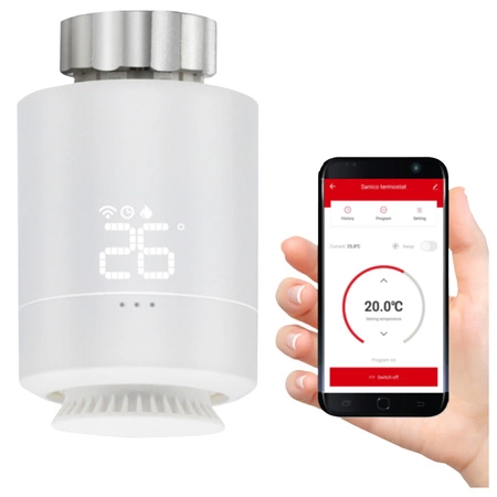 Inteligentna Głowica termostatyczna z możliwością sterowania za pomocą aplikacji mobilnej TUYASmart. Aplikację można pobrać na platformę Android w sklepie Google Play i Apple iOS w sklepie App Store. Wbudowany w głowicę moduł łączności bezprzewodowej pracującej w typowym dla WiFi paśmie 2,4 GHz pozwala na kontrolowanie urządzenia i jego funkcji z dowolnego miejsca na świecie, pod warunkiem, że nasz smartfon ma dostęp do internetu, a produkt jest w zasięgu domowej sieci Wi-Fi.