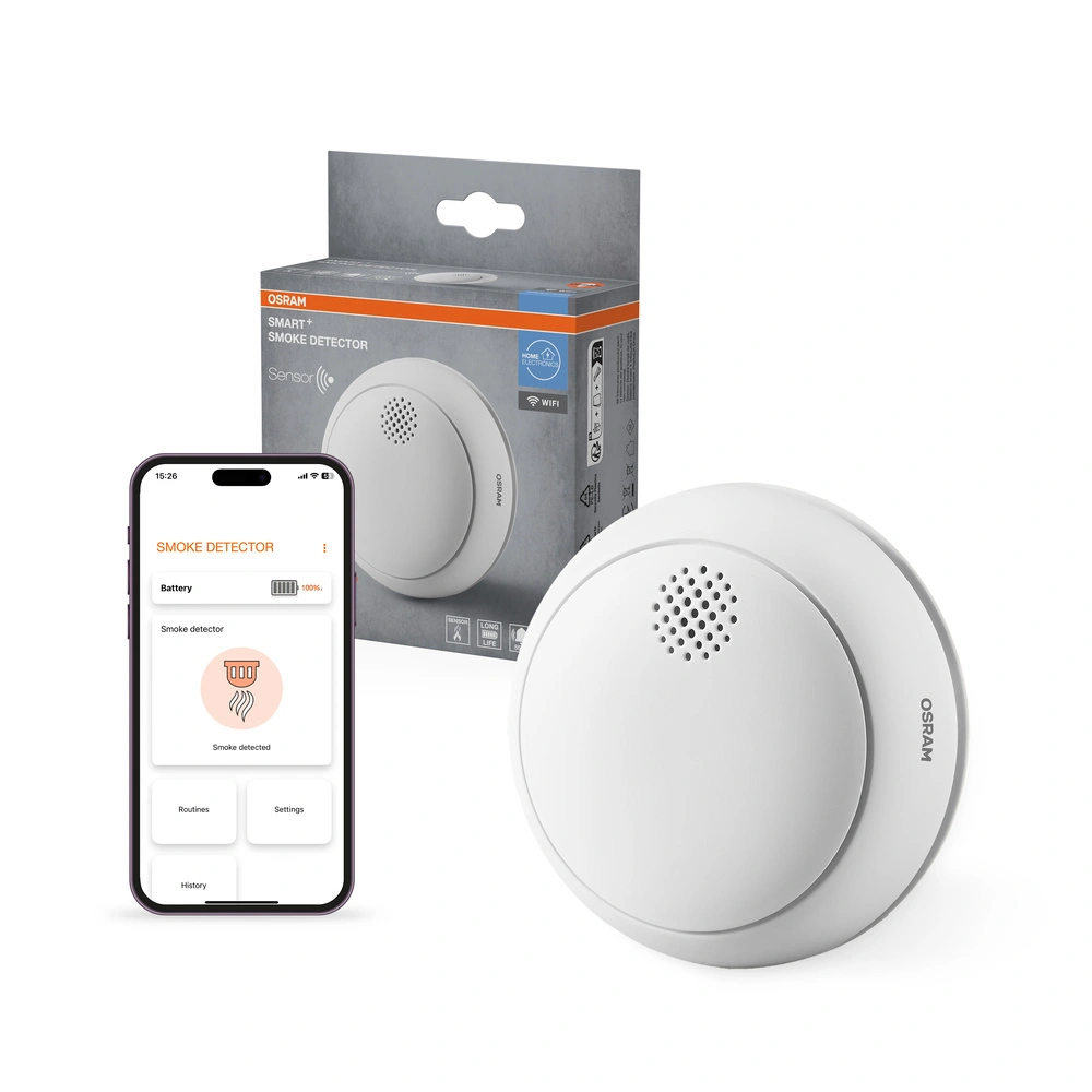 Czujnik dymu Osram SMART+ opracowany jest z myślą o niezawodności i łatwości użytkowania. Wyposażony w czujnik fotoelektryczny oraz funkcję autodiagnostyki, która regularnie sprawdza stan baterii i połączenie Wi-Fi, minimalizuje ryzyko fałszywych alarmów. Kompaktowa, bezprzewodowa konstrukcja ułatwia instalację w dowolnym miejscu w domu. W zestawie znajdziesz baterię CR123A, śruby oraz kołki montażowe, co pozwala na szybki montaż i natychmiastowe korzystanie z urządzenia. Zadbaj o bezpieczeństwo swoje i bliskich z Osram SMART+!