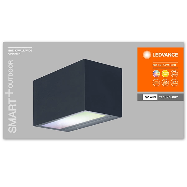 SMART Kinkiet z serii BRICK MULTICOLOR to produkt renomowanej i cenionej w branży oświetleniowej firmy LEDVANCE. Główną charakterystyczną cechą kinkietu jest możliwość bezpośredniego sterowania nim przy pomocy aplikacji mobilnej LEDVANCE SMART+, którą możemy pobrać w sklepie GOOGLE PLAY (Android 6.0 i nowszym) lub APP STORE (iOS 10 lub starszy). Dodatkową zaletą prezentowanej oprawy ściennej jest funkcja sterowania głosem przy pomocy Asystenta Google lub Amazon Alexa.