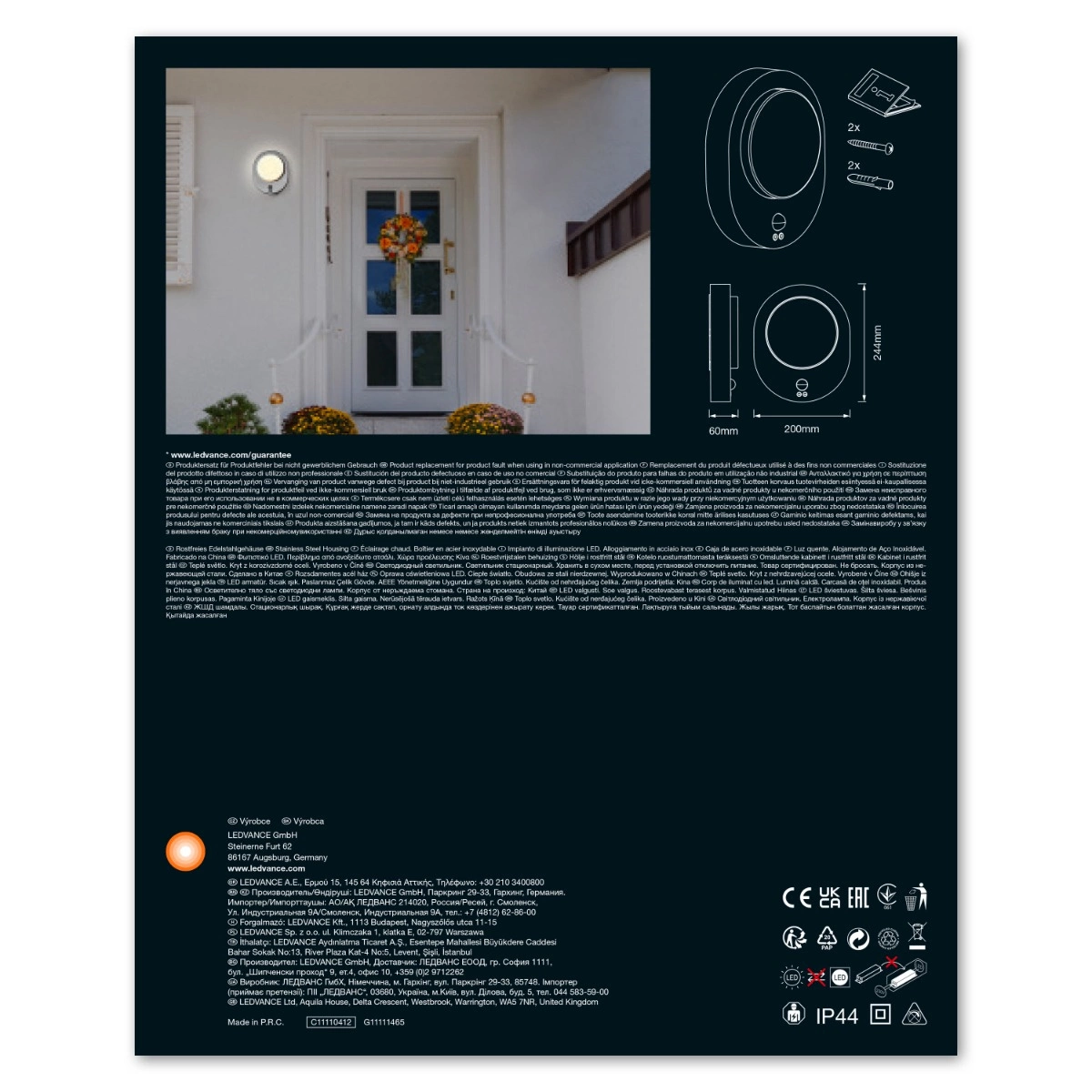 Lampa Ogrodowa Zewnętrzna Kinkiet Elewacyjny LED 8W 370lm 3000K IP44 Srebrny Z Czujnikiem Ruchu i Zmierzchu Endura Ledvance
