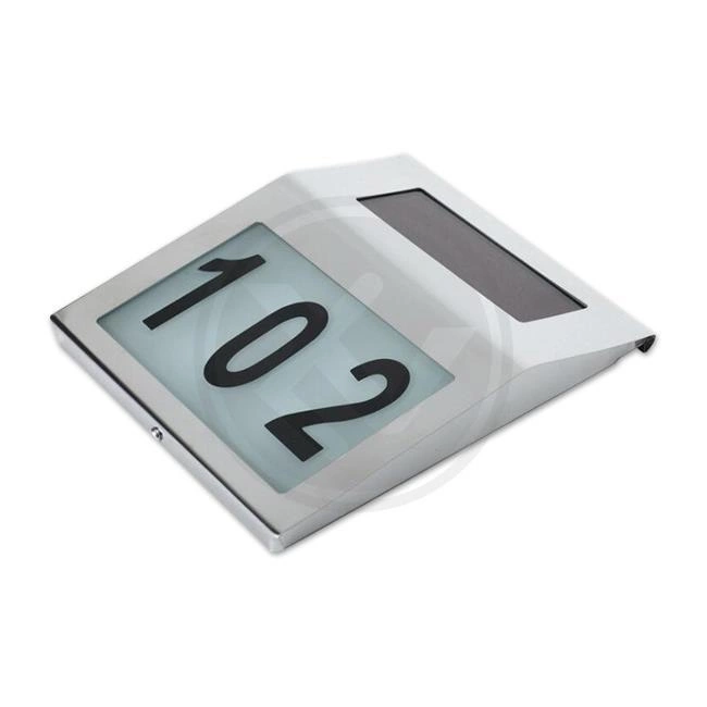 Lampa ogrodowa solarna NUMER DOMU, Kinkiet wykonanej z wysokiej jakości stali nierdzewnej w kolorze srebrnym (czarne, naklejane cyferki w zestawie) świetnie sprawdzi się jako praktyczne podświetlenie Twojego numeru domu oraz sprawi, że nikt nie będzie miał problemu z trafieniem pod Twój adres. Kinkiet został wyposażony w zintegrowane źródło światła LED zasilane energią słoneczną, emituje zimne światło o temperaturze barwowej ~6000K. Lampy solarne cechują się bezproblemowym podłączeniem, zapewniają delikatne światło bez konieczności instalacji przewodów elektrycznych.