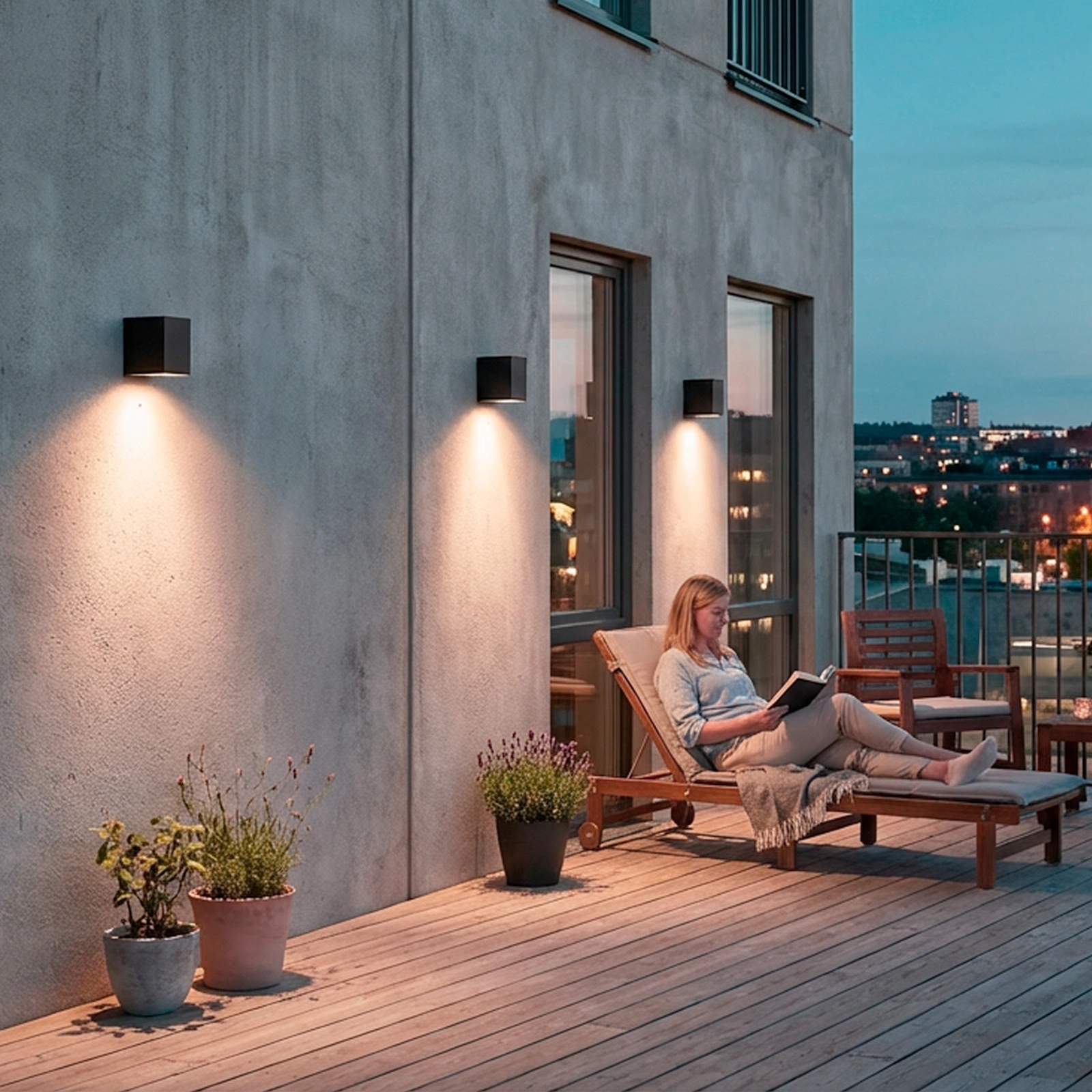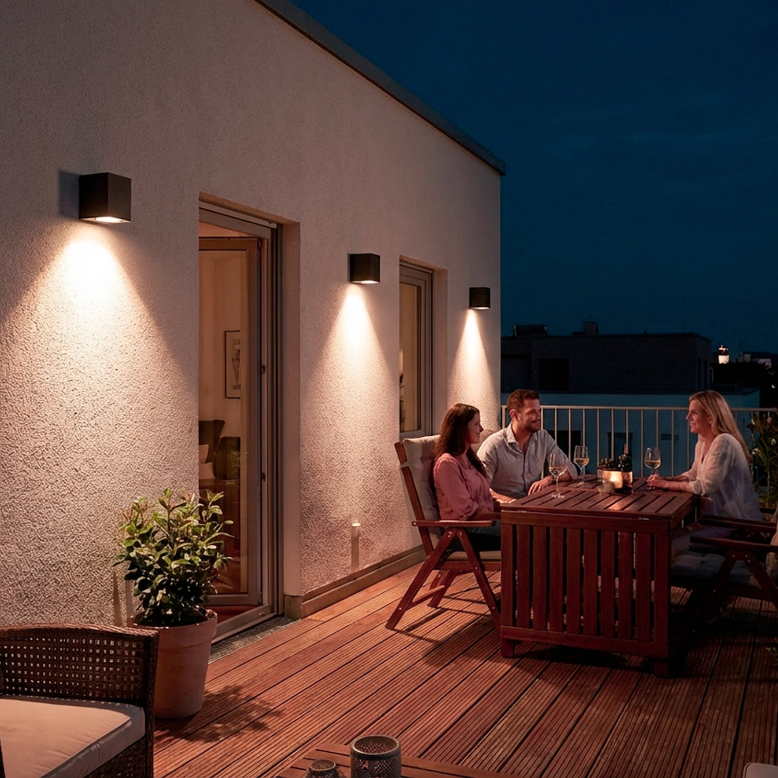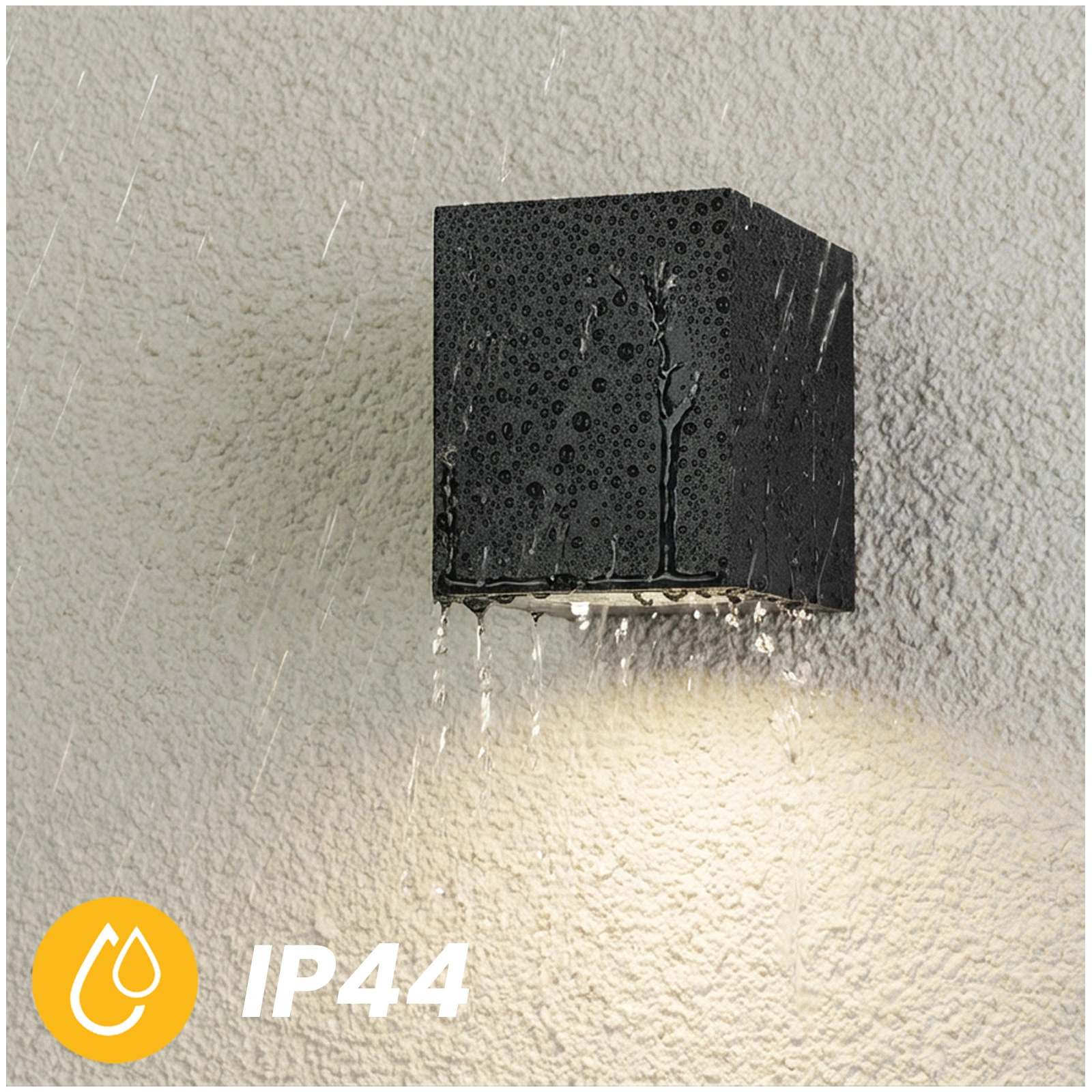 Kinkiet został zaprojektowany z myślą o bezpiecznym i niezawodnym użytkowaniu na zewnątrz. Szczelność na poziomie IP44, uzyskana dzięki silikonowym uszczelkom i zabezpieczonym połączeniom, skutecznie chroni wnętrze oprawy przed wilgocią oraz czynnikami atmosferycznymi. Dzięki temu możesz mieć pewność, że oświetlenie działa stabilnie niezależnie od pogody i zachowuje swój wygląd przez długi czas. To rozwiązanie, które daje spokój użytkowania i pozwala cieszyć się funkcjonalnym światłem na elewacji bez obaw o warunki zewnętrzne.