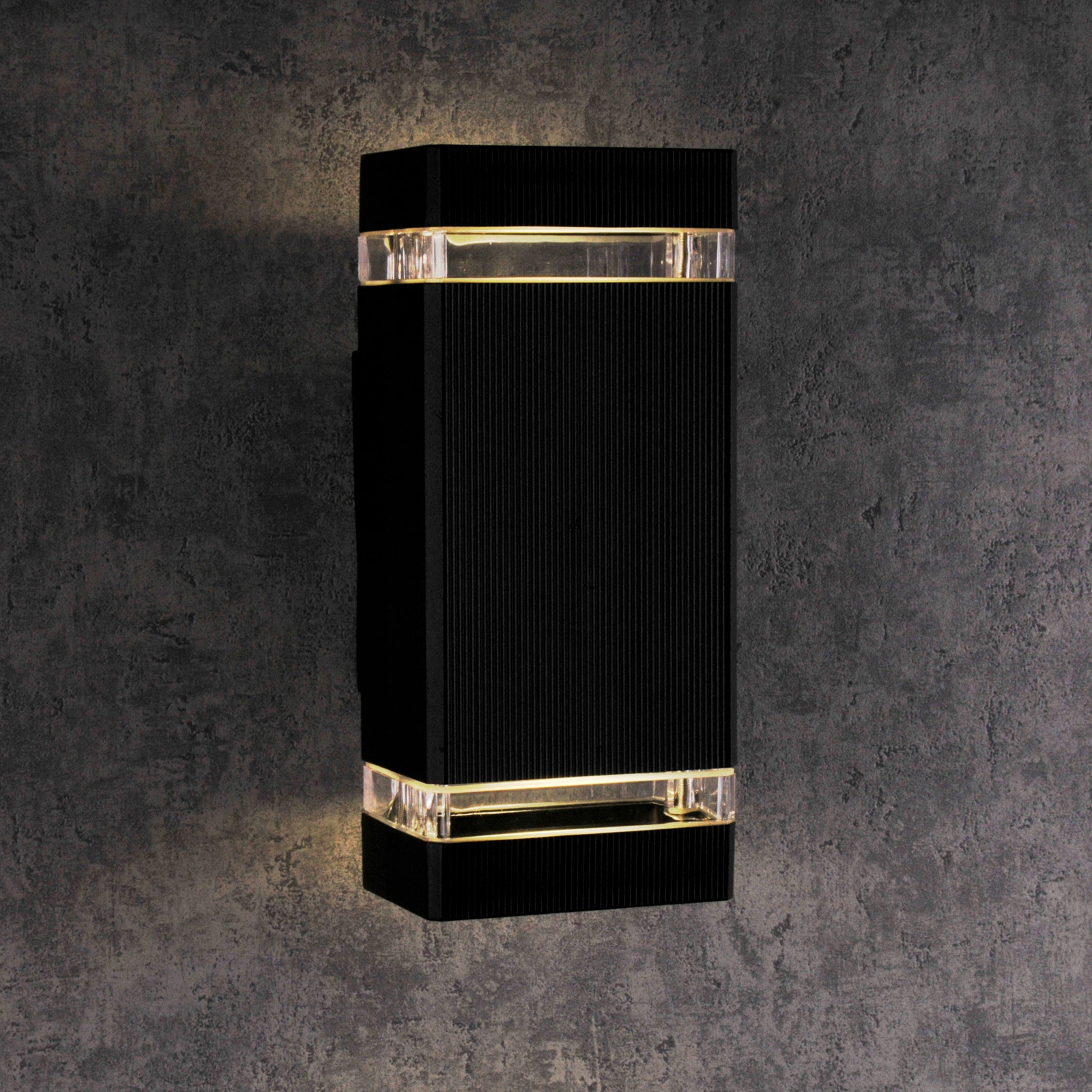 Oprawa ścienna LED model Gilbert to wykonana z aluminium oprawa w kolorze czarnym, która wyróżnia się oryginalnym i nowoczesnym wzornictwem. Kinkiet przystosowany został do pracy z dwoma wymiennymi źródłami świateł LED z gwintem GU10 i maksymalną mocą nieprzekraczającą 2x10W LED, dzięki czemu w łatwy sposób możesz skonfigurować odpowiednią moc jak i temperaturę światła wszędzie tam gdzie tego potrzebujesz. Nowatorski design sprawia, że oprawa świetnie pasuje do podświetlania nowoczesnych budynków, z którymi tworzy spójną i elegancką kompozycję.