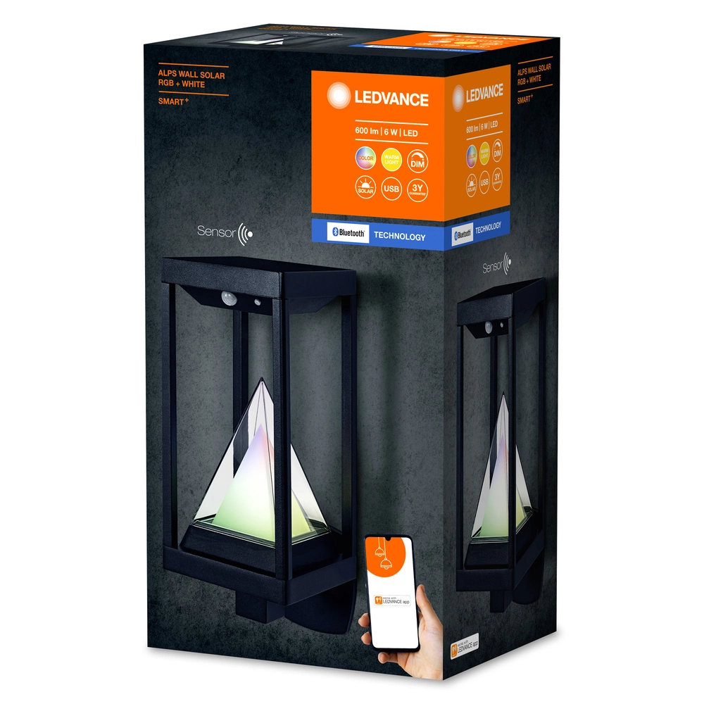 Lampa Solarna Zewnętrzna Inteligentny Kinkiet Elewacyjny 6W 400lm 3000K Ciepła RGB+W Ściemnialna IP44 Czarny SMART+ Bluetooth Alps Ledvance