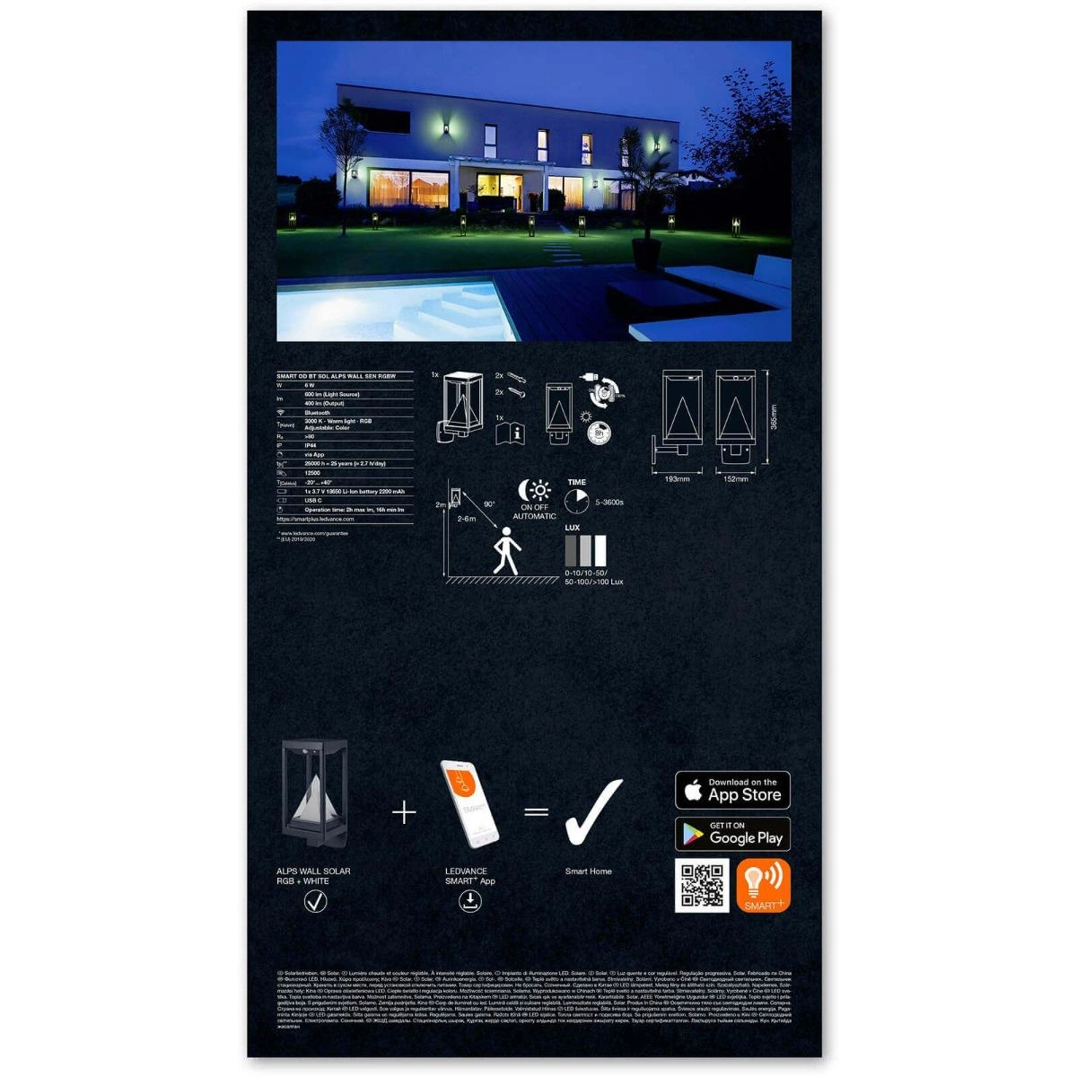 Lampa oferuje możliwość ściemniania oraz zmiany barwy światła (od białej ciepłej po wielokolorową RGB) dzięki protokolowi łączności Bluetooth. Wyposażona w czujnik ruchu, idealnie sprawdzi się w zmieniających się warunkach świetlnych. Wykonana z aluminium i poliwęglanu (PC), gwarantuje solidność i długotrwałość, co przekłada się na liczbę cykli wyłączeniowych 12500. Montaż naścienny (natynkowy) pozwala na łatwą instalację i użytkowanie. Produkt pochodzi z Chin.