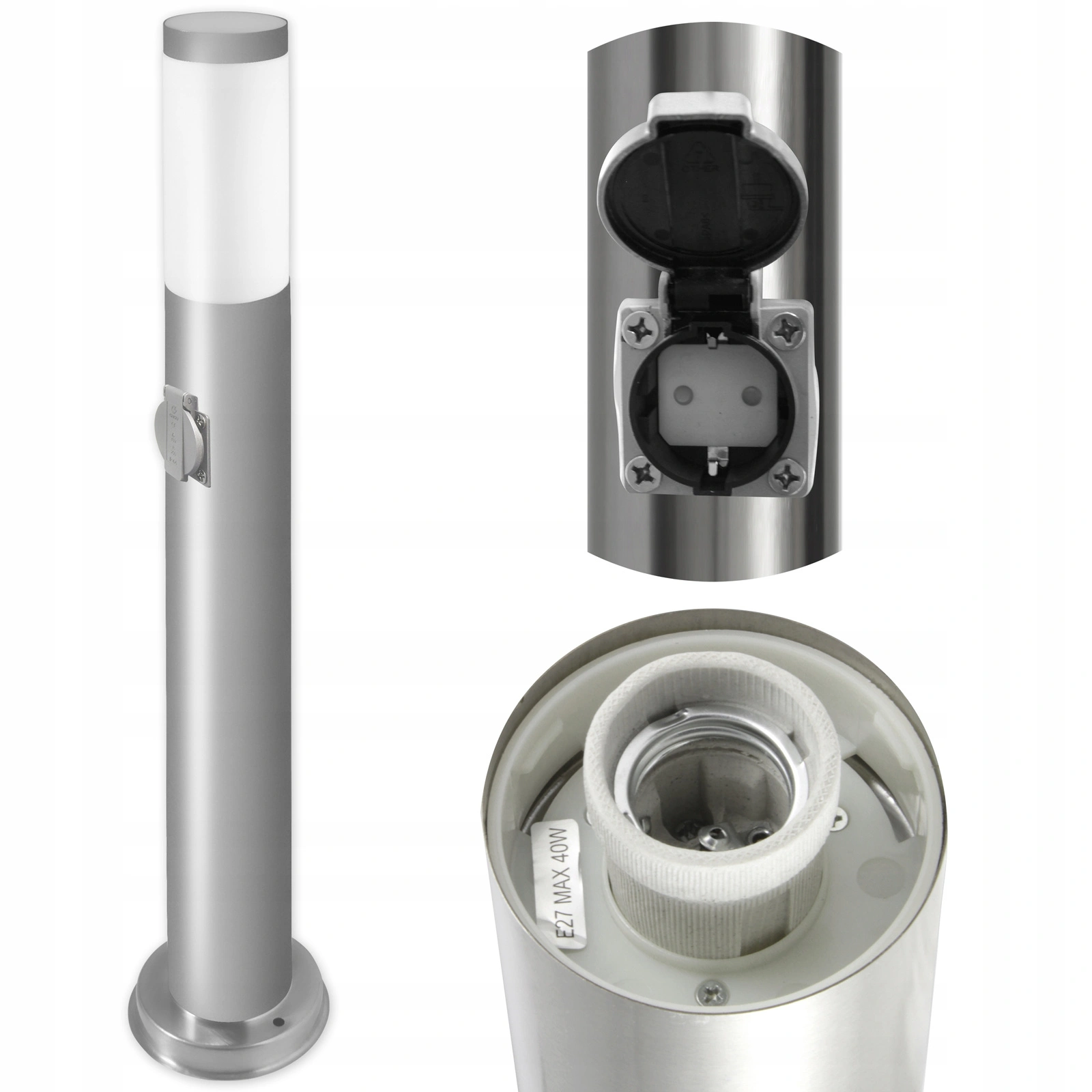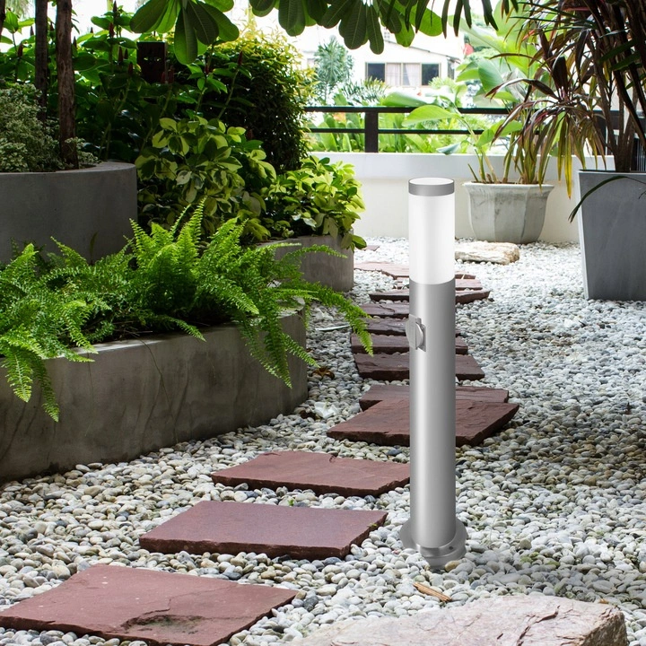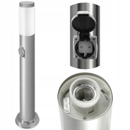 Lampa Ogrodowa, Słupek Zewnętrzny o wysokości 65cm w kolorze srebrnym ze wbudowanym gniazdem sieciowym 230V. Lampa wykonana z wysokiej jakości stali nierdzewnej oraz tworzywa sztucznego. Zastosowanie stali nierdzewnej do produkcji lampy sprawia, że jest ona trwała, prosta w czyszczeniu, a zarazem atrakcyjna w wyglądzie. Lampa stworzona została z myślą o jej użytkownikach, zastosowano w niej popularny trzonek E27 - który pozwala na wkręcenie dowolnej Żarówki o tym gwincie a jej moc nie przekracza 20W w przypadku Żarówki LED.