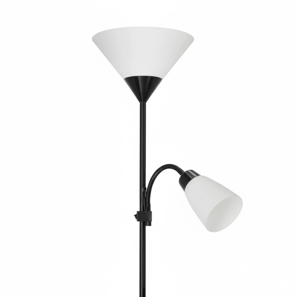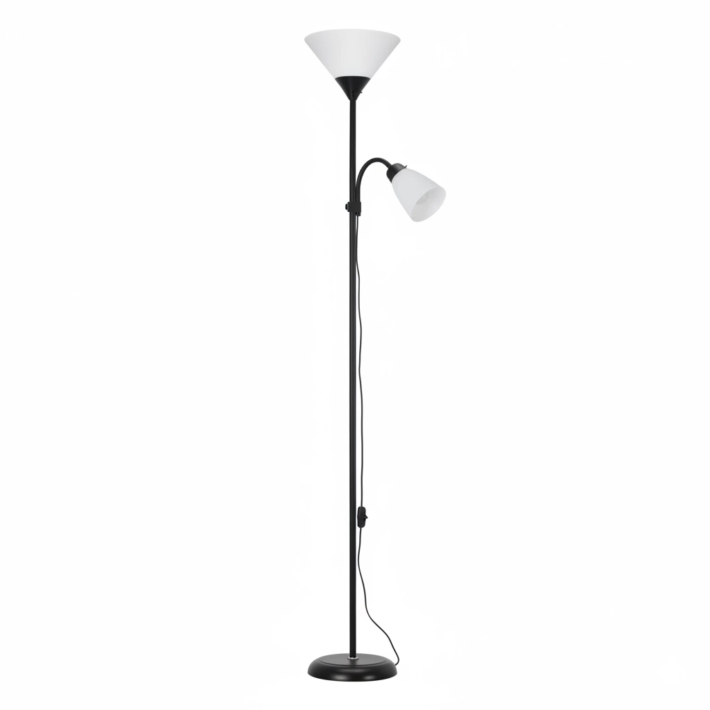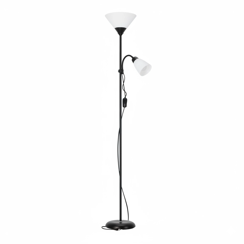 Lampa podłogowa 2-punktowa to praktyczne i eleganckie oświetlenie do salonu, sypialni lub biura. Posiada dwa niezależne gniazda – 1xE27 dla światła ogólnego oraz 1xE14 na elastycznym ramieniu, które umożliwia precyzyjne skierowanie światła w górę, w dół lub w dowolnym kierunku, idealne do czytania czy pracy. Oddzielne włączniki na przewodzie zasilającym pozwalają włączać każde źródło osobno, dopasowując oświetlenie do aktualnych potrzeb. Wysokość lampy można regulować dzięki konstrukcji z pięciu modułów po 33 cm – wystarczy wyjąć wybrane elementy, aby uzyskać niższą formę. Długi przewód 1,2 m ułatwia ustawienie w dowolnym miejscu pomieszczenia. Lampa sprzedawana jest bez źródeł światła, co daje swobodę wyboru mocy i barwy żarówek, tworząc idealny nastrój w każdej aranżacji.