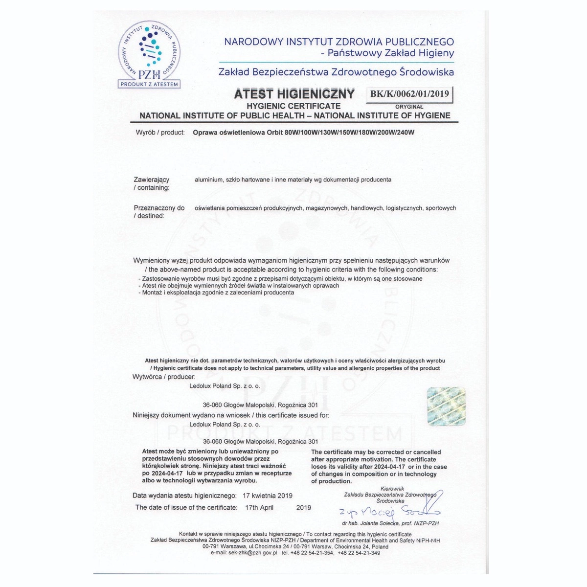 Oprawa posiada certyfikat CE, RoHs oraz Atest Higieniczny PZH, który potwierdza, że oprawa ORBIT jest zgodna z obecnymi normami w dziedzinie bezpieczeństwa.
