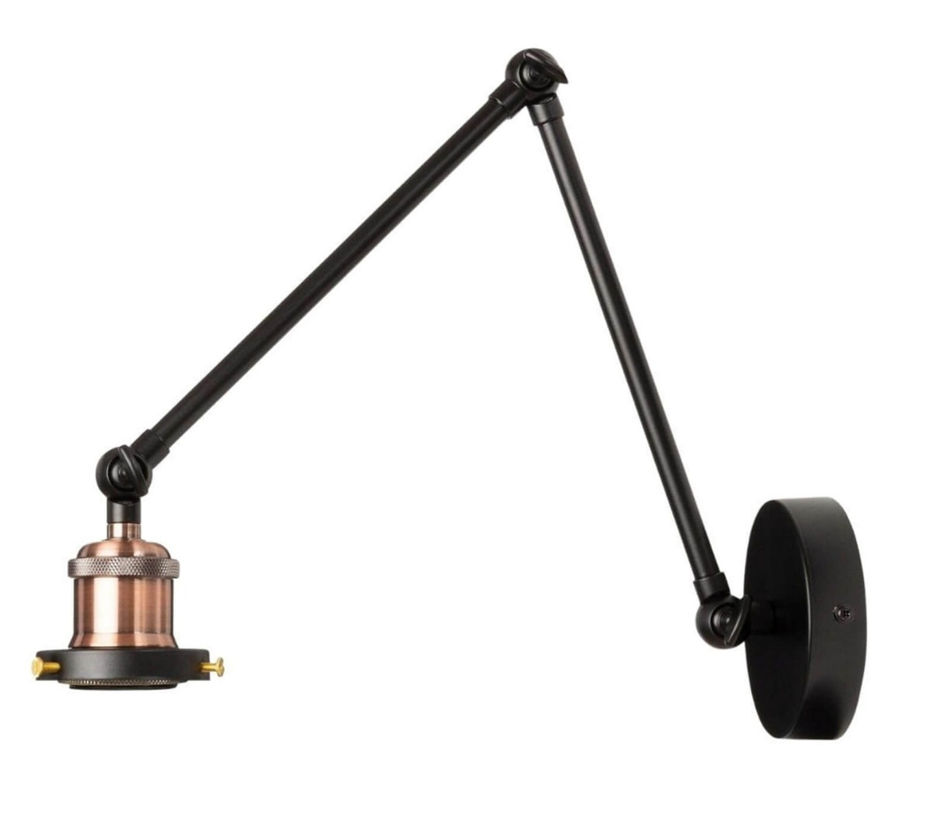 Prezentowana lampa ścienna to ciekawa propozycja do nowoczesnych wnętrz o loftowej aranżacji. Lampa wykonana jest z metalu w kolorze matowej czerni. Wyjątkowa oprawa w kolorze miedzianym pełni funkcję nie tylko użytkową, ale także dekoracyjną. Kinkiet ma trzy poziomy regulacji motylkowej: u podstawy przy maskownicy, w przegubie ramienia oraz przy samym kloszu kierując światło według preferencji w górę lub dół. Daje to maksymalny komfort użytkowania i możliwość optymalnego ustawienia. Doskonale zaprezentuje się na tle betonu i surowej cegły, a także może być odważnym akcentem w rustykalnych wnętrzach. Z racji odsłoniętego miejsca na źródło światła, lampę warto uzupełnić o ozdobną żarówkę o trzonku typu E27.