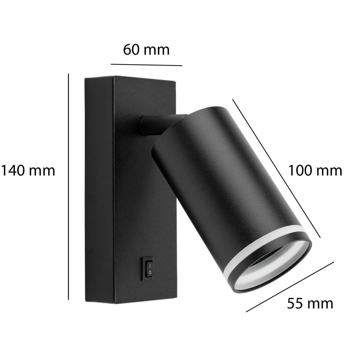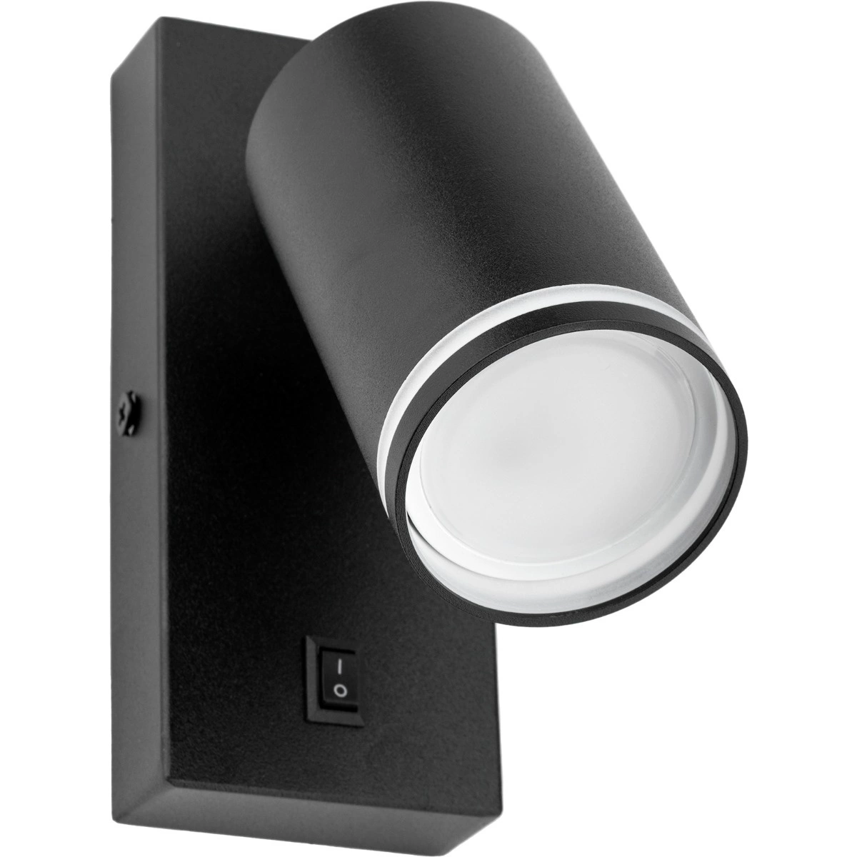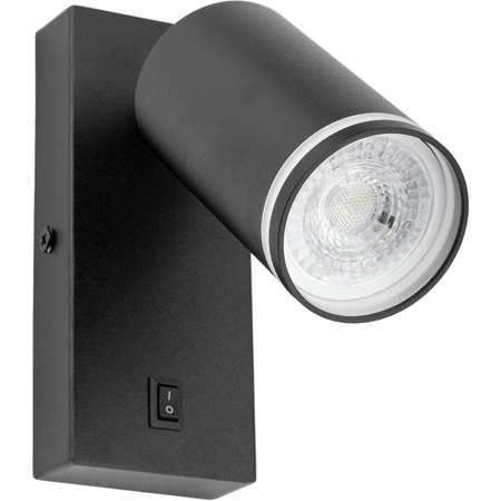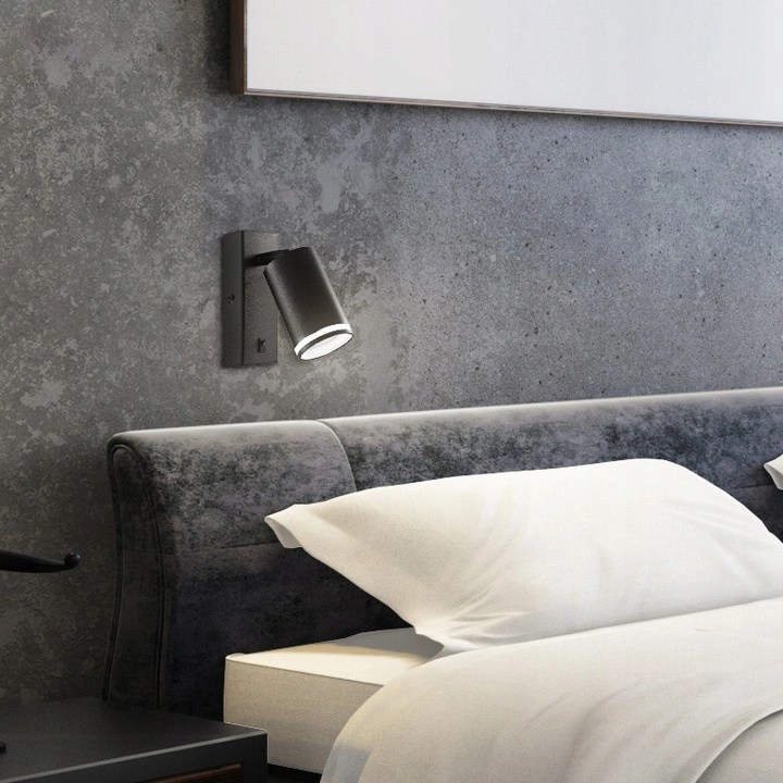 Kinkiet ścienny koloru czarnego na wymienne źródło światła o trzonku GU10. Lampa wykonana z wysokiej stali, aluminium i akrylu, posiada dekoracyjny pierścień. Lampa posiada włącznik do czytania umożliwiający łatwe włączanie światła.