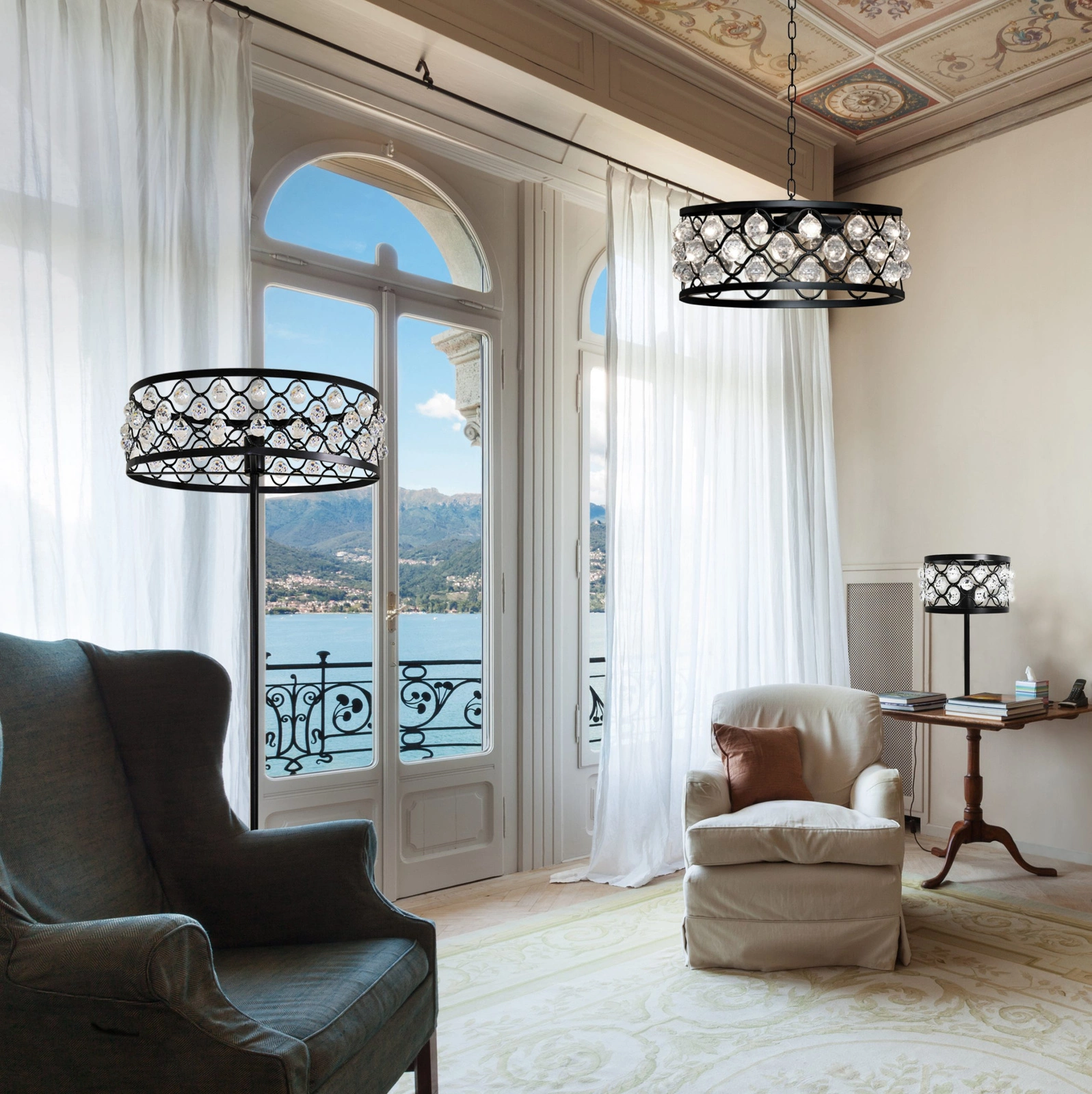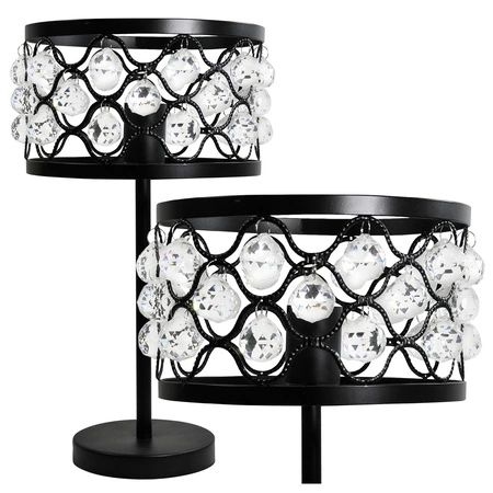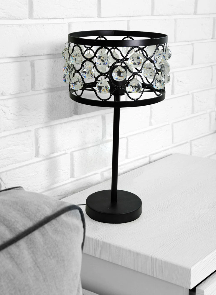 Stojąca lampa stołowa z serii VEJLE ma niezwykle ozdobną, elegancką formę. Jej czarna, metalowa konstrukcja ozdobiona została kroplami szkła. Wspaniale prezentuje się we wnętrzach nowoczesnych, gdzie pojawiają się detale w kolorze czarnym. Może być ciekawym przełamaniem surowego wnętrza w stylu loftowym. Będzie pasować również do aranżacji inspirowanych stylem retro i glamur. Stworzona została z dużą dbałością o szczegóły z wysokiej jakości stali i pięknie oszlifowanego szkła, które w dzień pięknie się mieni. Wieczorem natomiast lampa pozwala uzyskać niezwykły efekt rozproszenia światła. Sprawdzi się przede wszystkim w sypialni, jako lampka nocna. Interesujący efekt osiągniemy umieszczając ją również w salonie, jako dodatkowe źródło światła, pozwalające uzyskać przytulny klimat sprzyjający wieczornemu relaksowi.