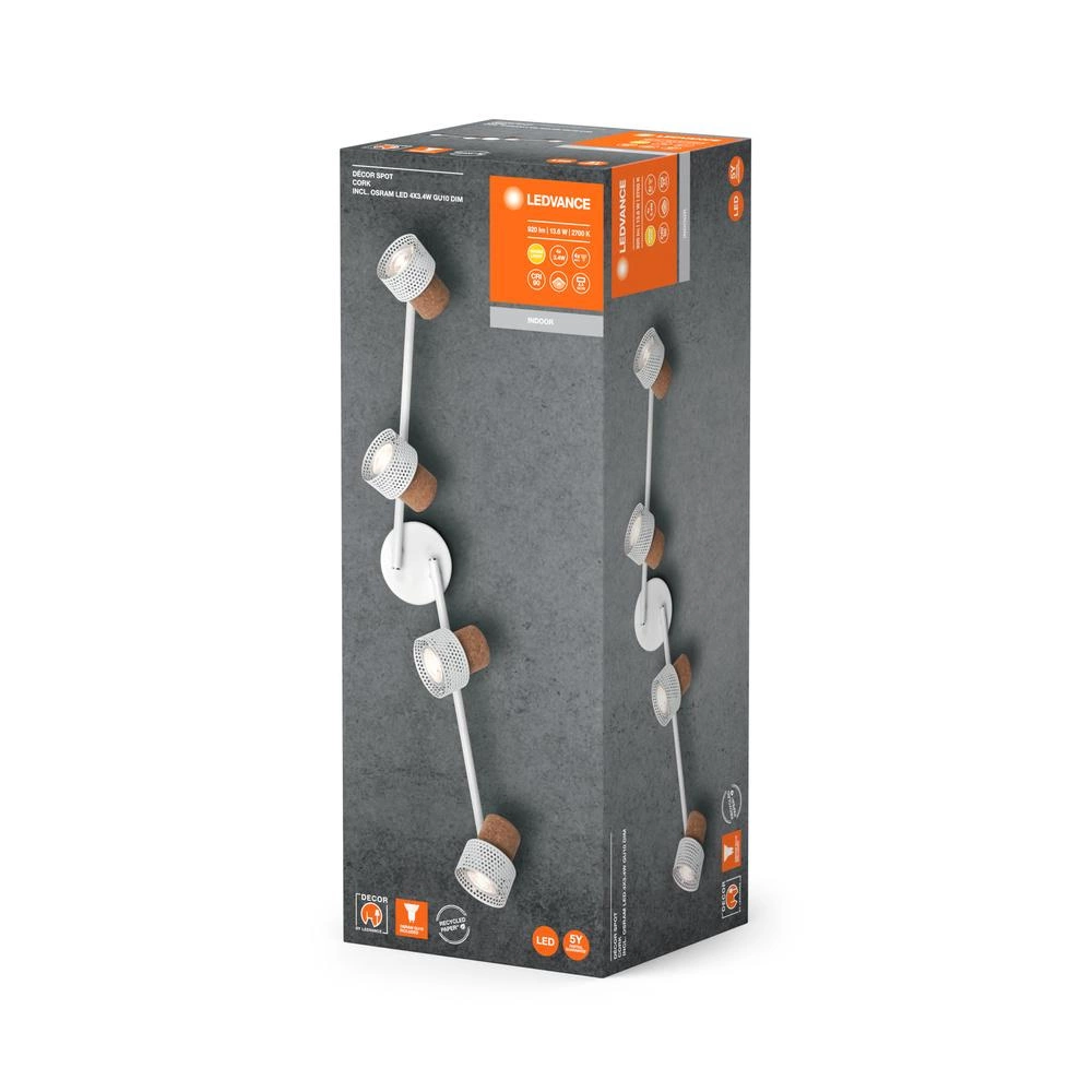 Decor Spot Cork GU10 White 4x3.4W 927 DIM od Ledvance to nowoczesna. stylowa oprawa sufitowa i ścienna. która łączy funkcjonalność z wyjątkowym designem. Wykonana z metalu i korka. dostępna w matowej czerni. oprawa nadaje wnętrzom elegancki. industrialny charakter. Trzy regulowane głowice z gniazdami GU10 i możliwością wymiany źródeł światła zapewniają elastyczność w doborze oświetlenia. Dzięki prostemu montażowi i trwałości do 25 000 godzin. oprawa jest doskonałym wyborem do zastosowań w domach oraz przestrzeniach komercyjnych.