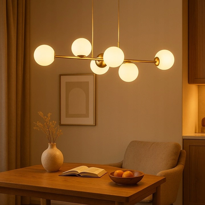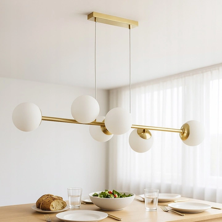 Lampa wyposażona jest w aż 6 punktów świetlnych, które doskonale sprawdzają się w większych pomieszczeniach, zapewniając równomierne, efektowne i komfortowe oświetlenie całej przestrzeni. Złote wykończenie połączone z mlecznymi kloszami nadaje oprawie prestiżowy charakter, podkreślając styl wnętrza i dodając mu nowoczesnej elegancji.