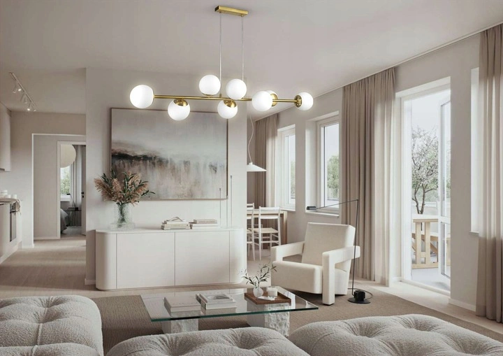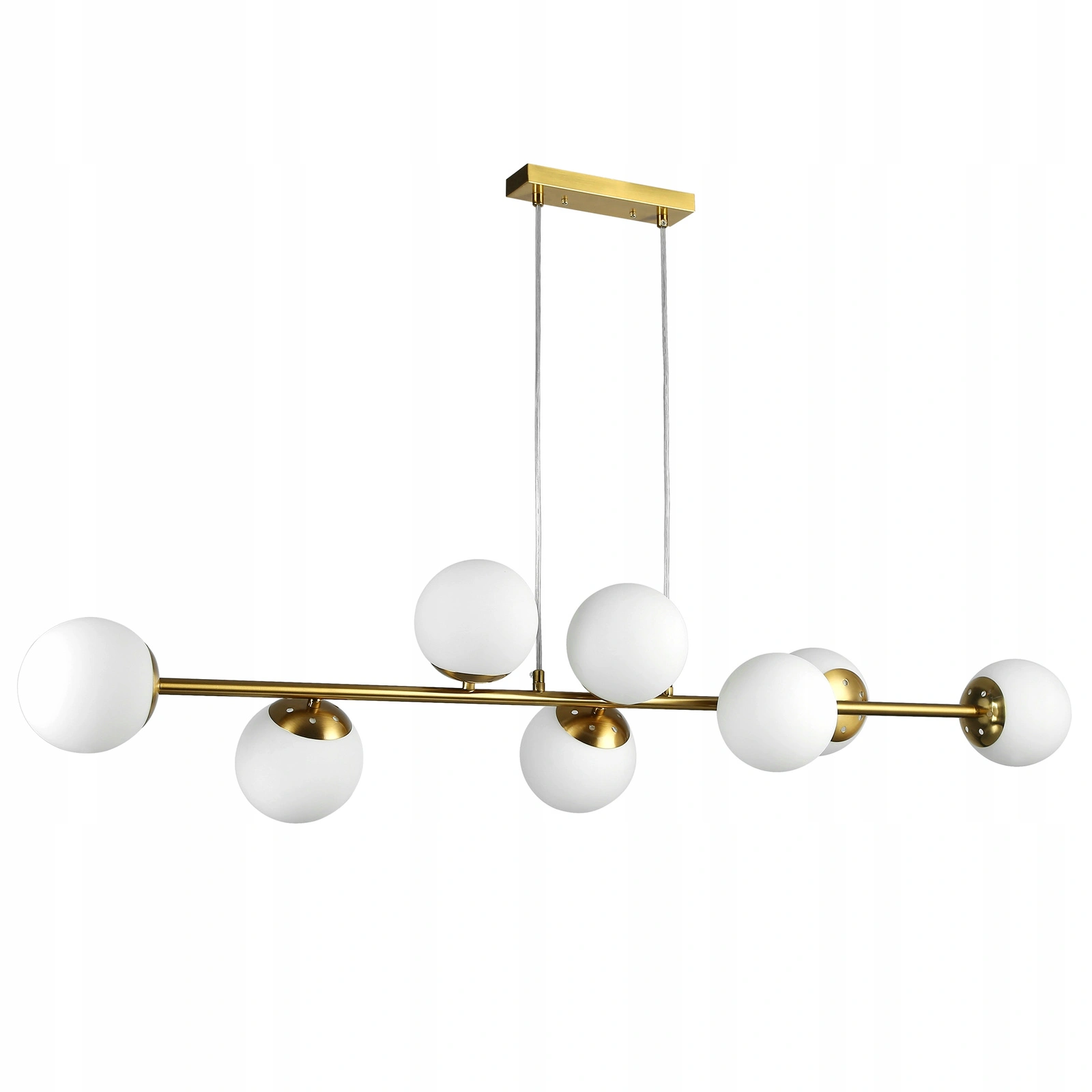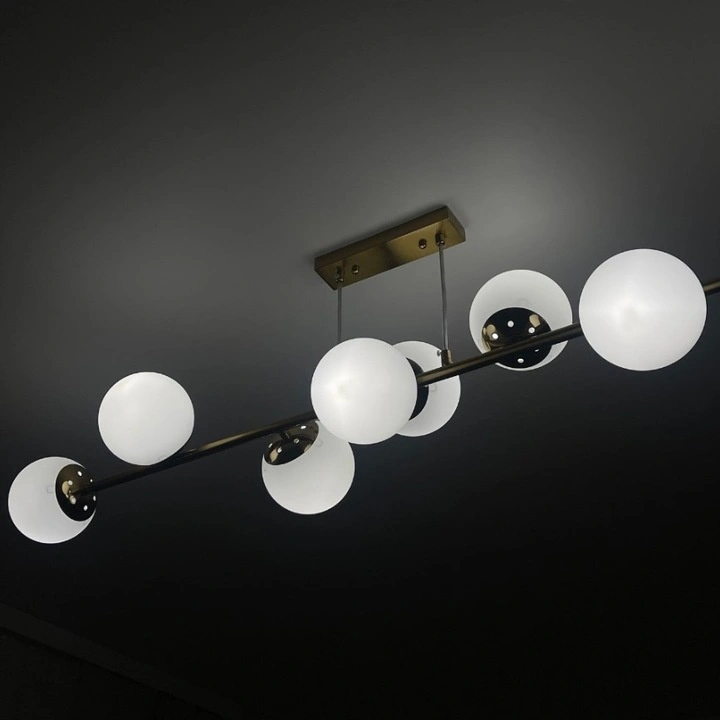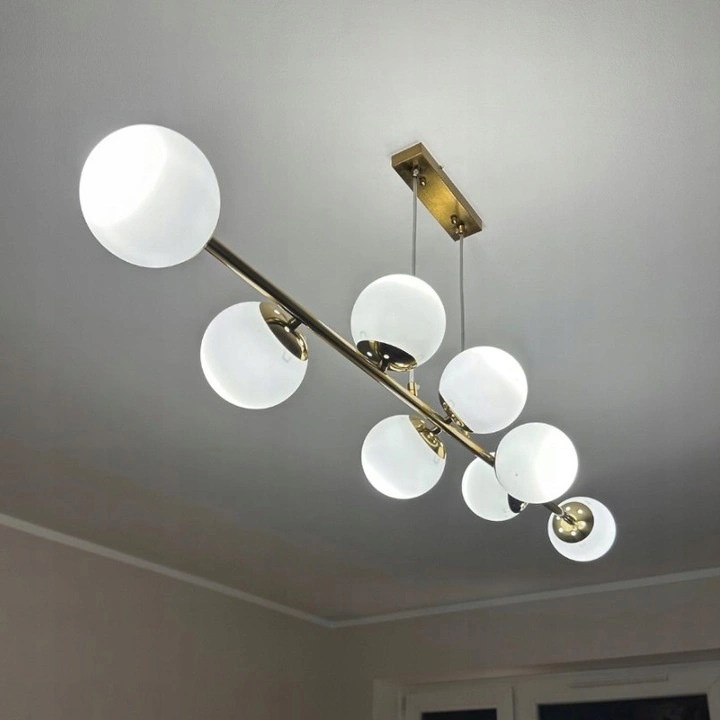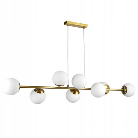 Lampa wyposażona jest w aż 8 punktów świetlnych, dzięki czemu idealnie sprawdza się w większych pomieszczeniach, zapewniając równomierne, jasne i efektowne oświetlenie całej przestrzeni. Złote wykończenie w połączeniu z mlecznymi kloszami tworzy nowoczesny, prestiżowy design, który podkreśli charakter wnętrza i nada mu elegancji.