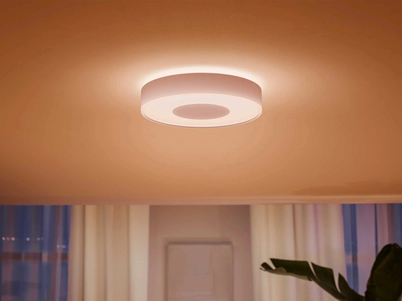 Philips Hue Infuse Medium White and Color Ambiance to inteligentna lampa sufitowa, która wprowadza do wnętrza nowy wymiar światła. Dzięki technologii LED i milionom kolorów możesz tworzyć dowolne nastroje – od ciepłej, relaksującej poświaty po chłodne, energetyzujące oświetlenie sprzyjające koncentracji. Subtelny efekt świetlnego halo sprawia, że światło łagodnie rozlewa się po suficie, dodając przestrzeni elegancji i głębi.