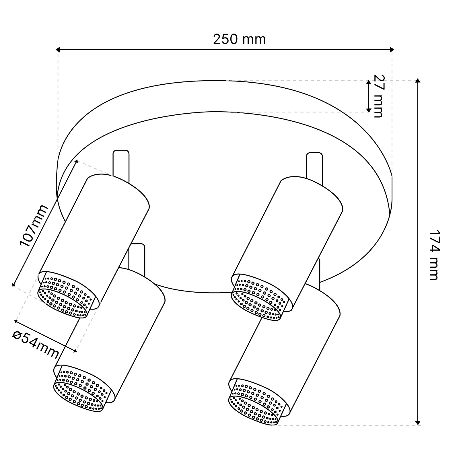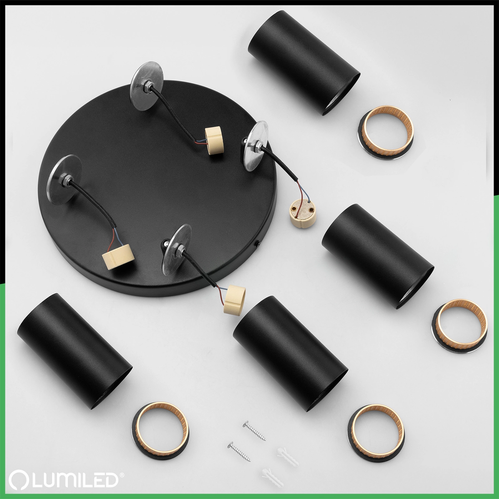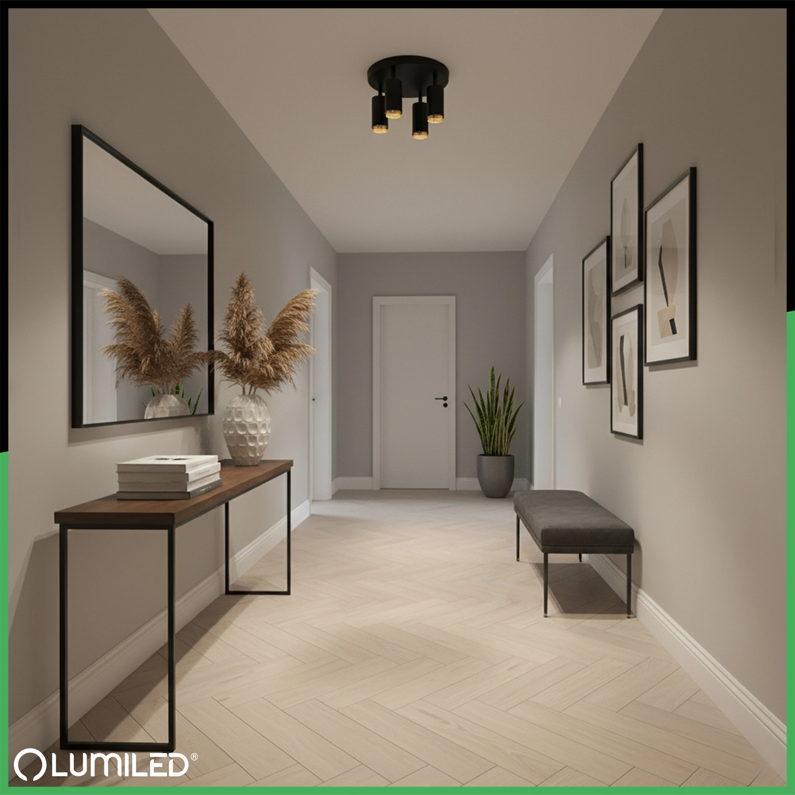 Lampa sufitowa marki LUMILED posiada cztery gniazda GU10, które pozwalają wybrać żarówki LED o dowolnej barwie i mocy – od ciepłych po zimne, także w wersji smart. Maksymalna moc 4x12W to jasne, energooszczędne światło i niższe rachunki. Gotowa kostka GU10 przyspiesza montaż, dzięki czemu instalacja jest prosta i nie wymaga dodatkowych elementów.
