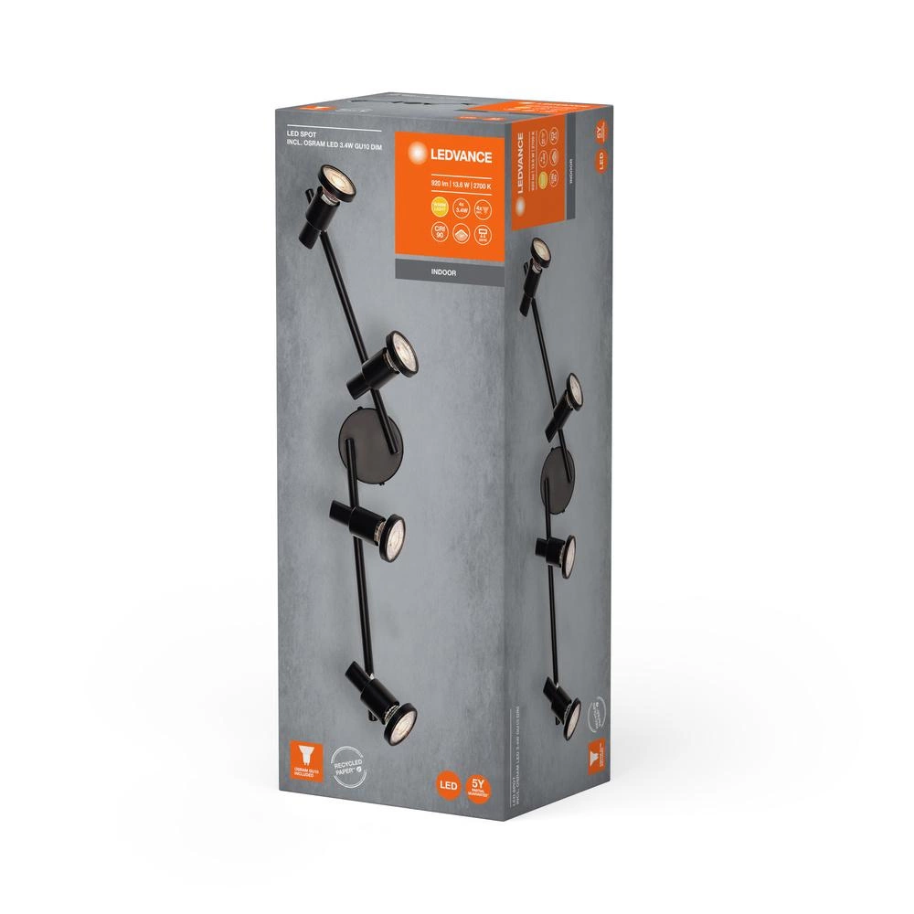 Reflektor LED Spot Ledvance to elegancka i funkcjonalna oprawa sufitowa o ponadczasowym designie. dostępna w wersji matowej czerni. Wyposażona jest w cztery wymienne i ściemnialne lampy LED OSRAM o barwie ciepłej bieli. zapewniając komfortowe. przytulne oświetlenie w każdym pomieszczeniu. Wysoka jakość wykonania i łatwy montaż sprawiają. że reflektor ten jest doskonałym wyborem zarówno do wnętrz nowoczesnych. jak i klasycznych.