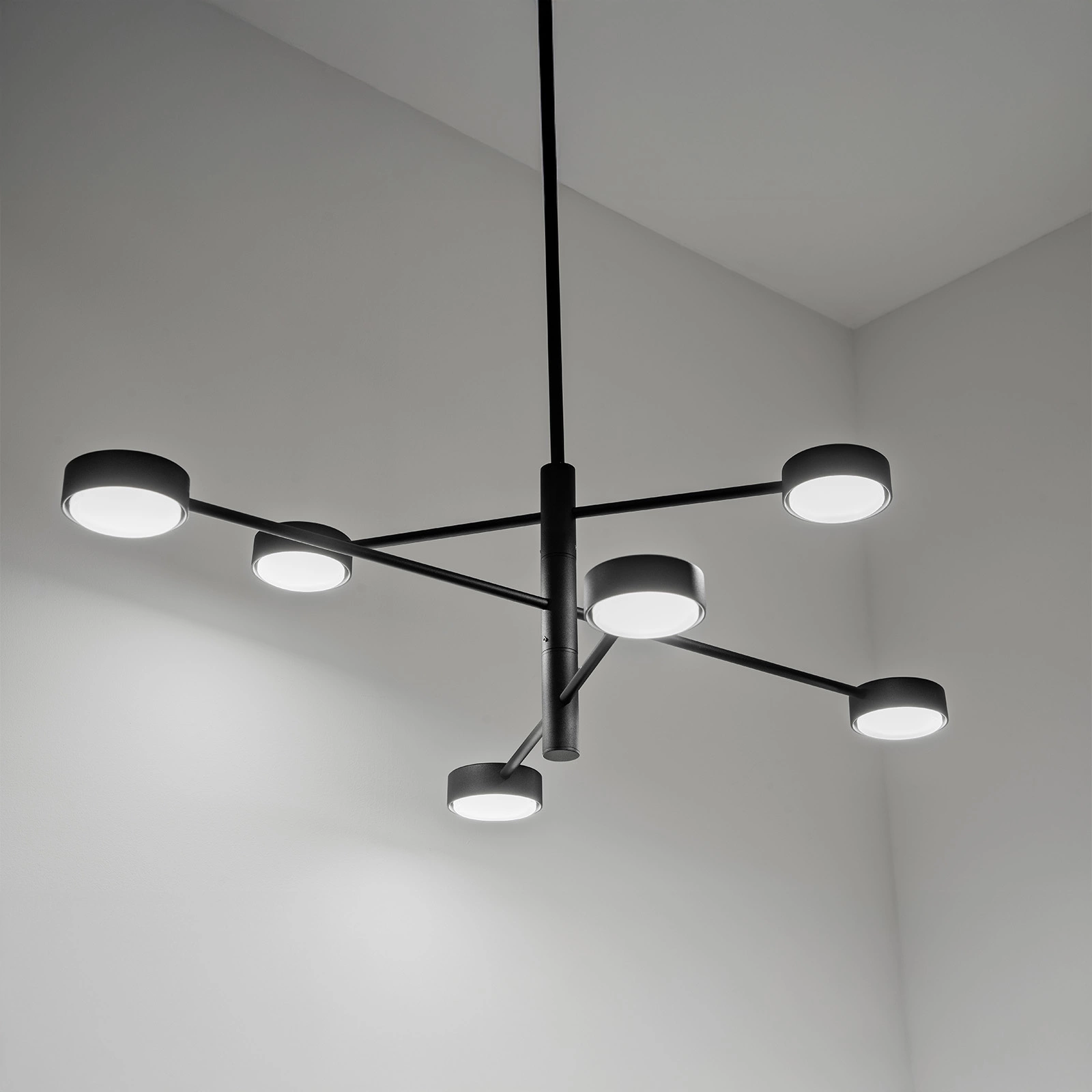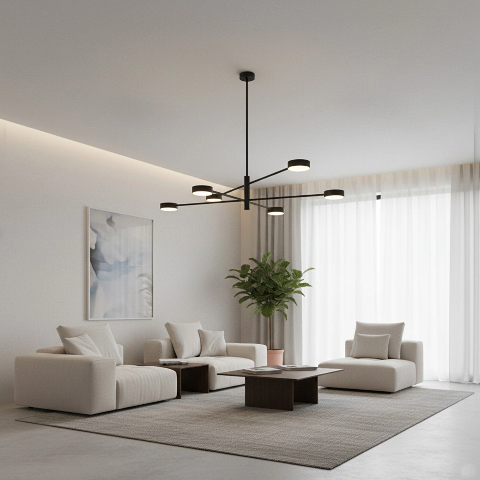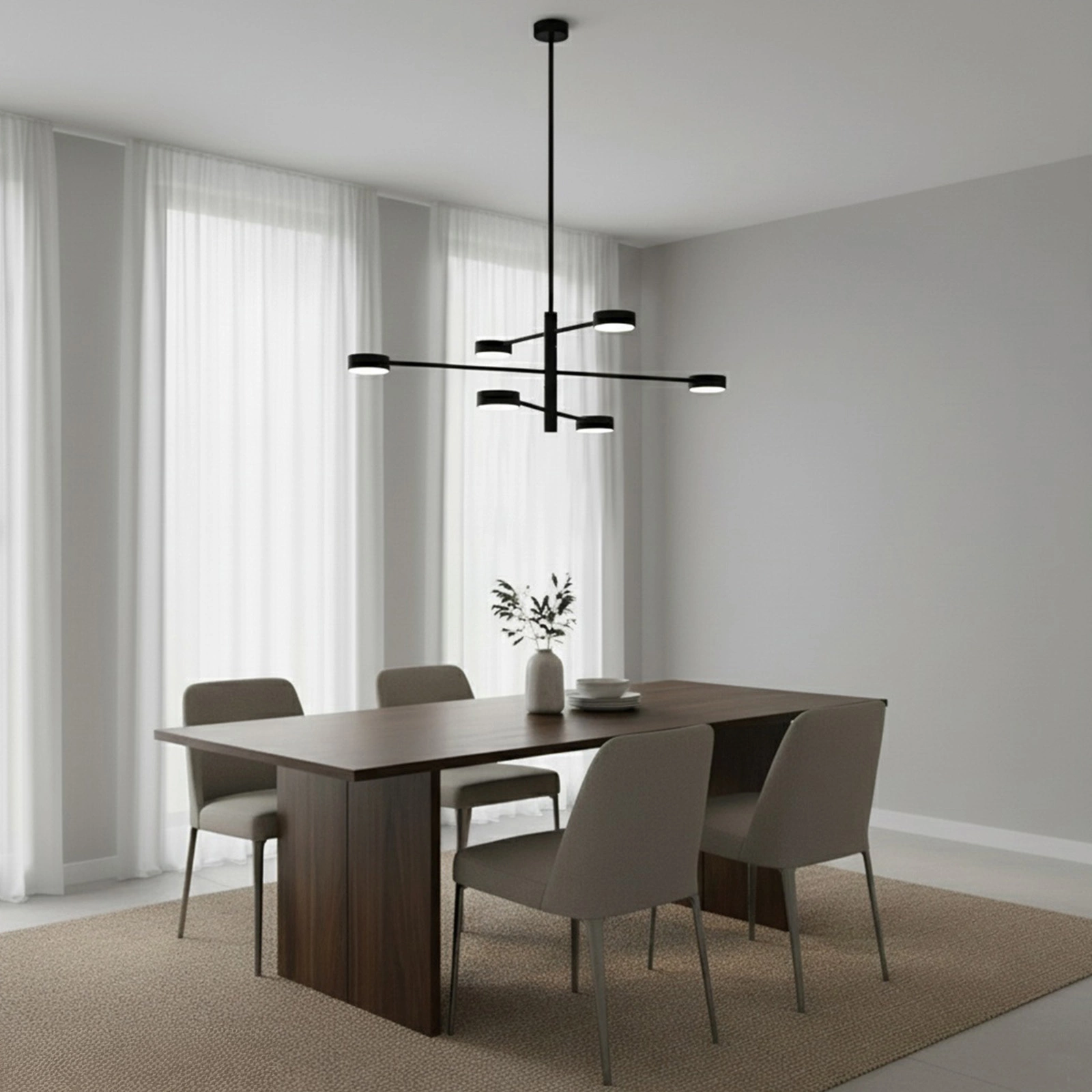 Żyrandol został zaprojektowany tak, aby harmonijnie wkomponować się w każde wnętrze. Nie zajmuje dużo miejsca, a jednocześnie zapewnia wyraźne i komfortowe oświetlenie. Czarne wykończenie dodaje mu elegancji i sprawia, że pasuje zarówno do nowoczesnych aranżacji, jak i do wnętrz w stylu loftowym. To praktyczne rozwiązanie dla osób, które chcą połączyć estetykę z codzienną funkcjonalnością – idealnie sprawdzi się w salonie, biurze czy korytarzu.
