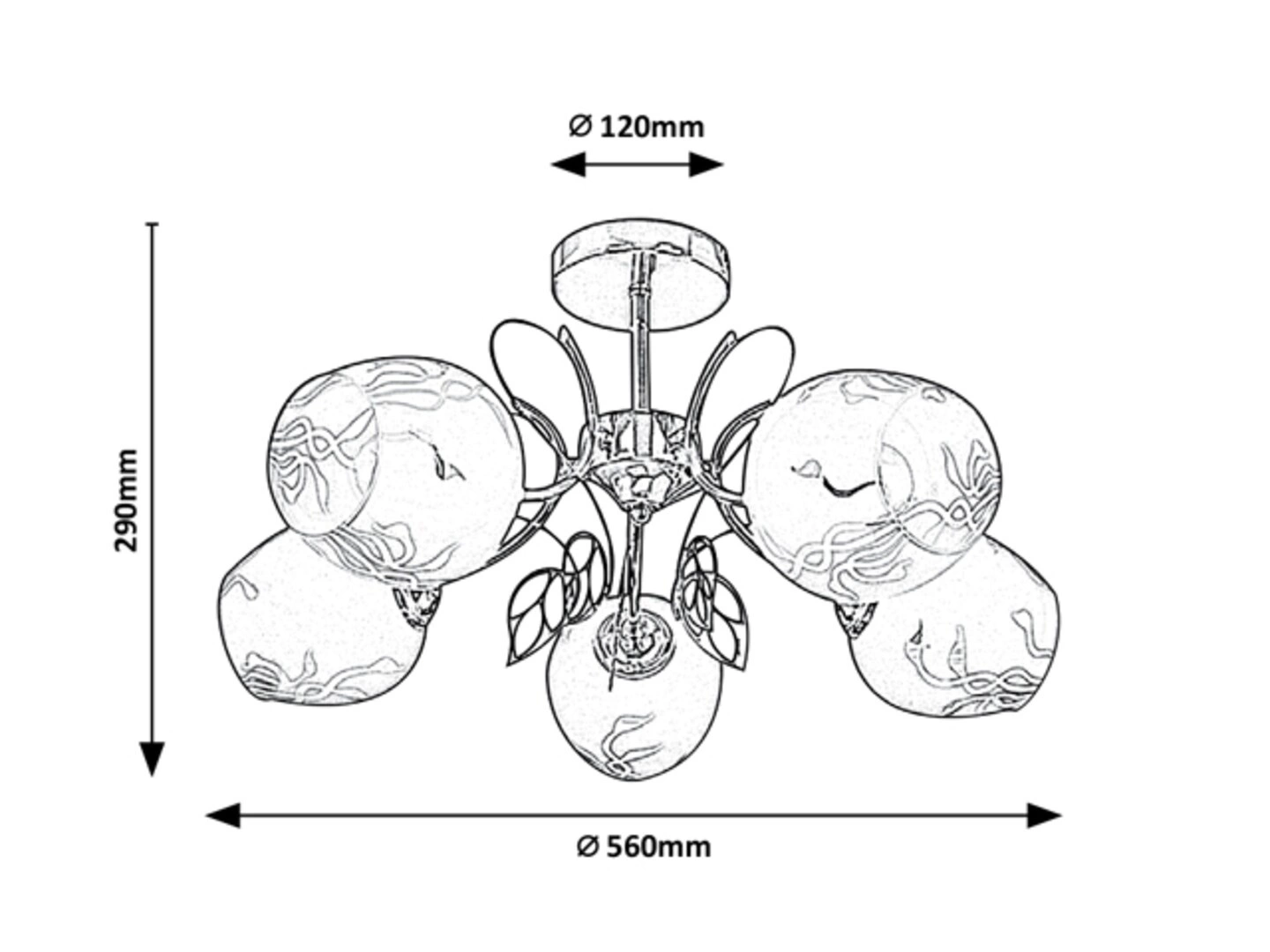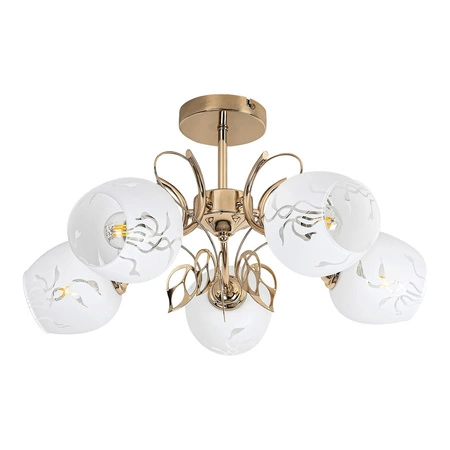 Dzięki pięciu oprawkom na żarówki E27, lampa zapewnia dużo światła oraz pozwala na swobodną personalizację natężenia oświetlenia. Złote wykończenia dodają wnętrzu ciepła i elegancji, co sprawia, że żyrandol doskonale komponuje się zarówno z klasycznymi, jak i nowoczesnymi aranżacjami przestrzeni. Produkt ten to synonim stylu i funkcjonalności, który z pewnością stanie się głównym punktem wystroju każdego pomieszczenia, w którym zostanie umieszczony.