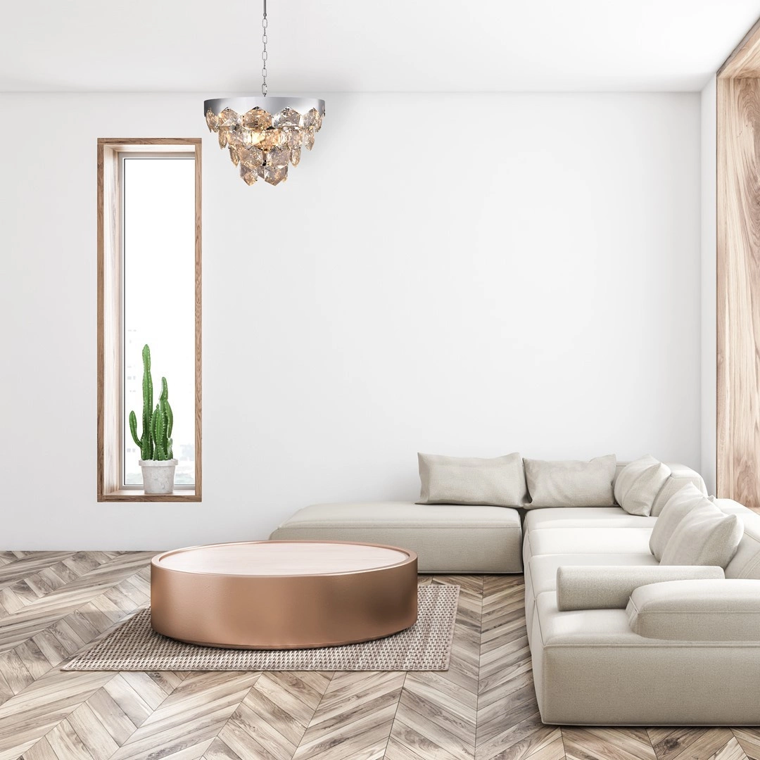 Żyrandol wyróżnia się swoim designem, który idealnie sprawdzi się w przestrzeniach typu glamour. Lampa została wykonana z wysokiej jakości materiałów: metal i kryształ, co nadaje jej bardzo eleganckiego charakteru. Model dostępny jest w chromie i złocie. Światło odbijające się od mieniących się kryształów sprawi, że żyrandol będzie dobrze się prezentował zarówno w salonie jak i w sypialni. Może również stanowić element ozdobny w lokalach użytkowych.