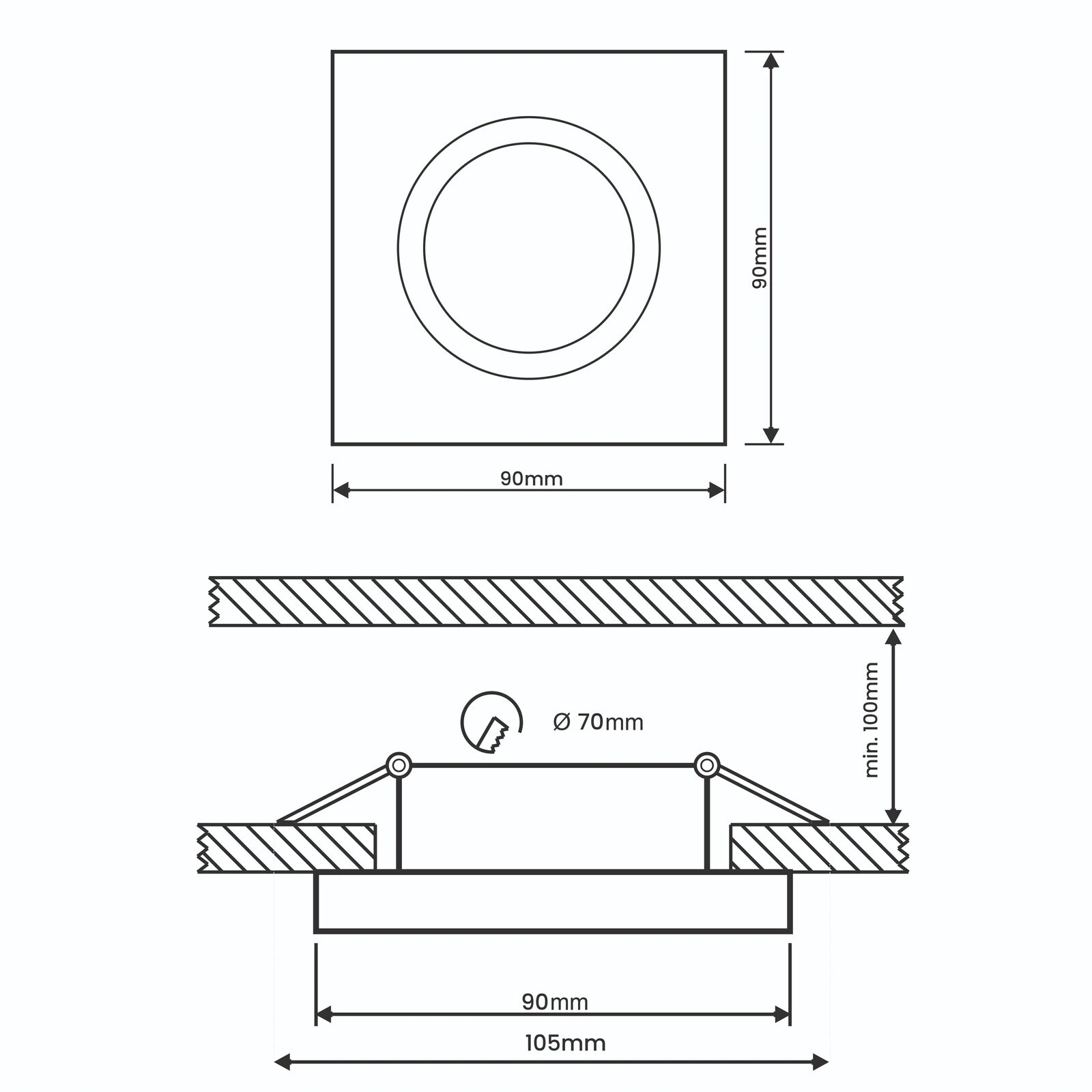 - Montaż podtynkowy pozwala na szybkie i sprawne osadzenie oprawy w suficie.