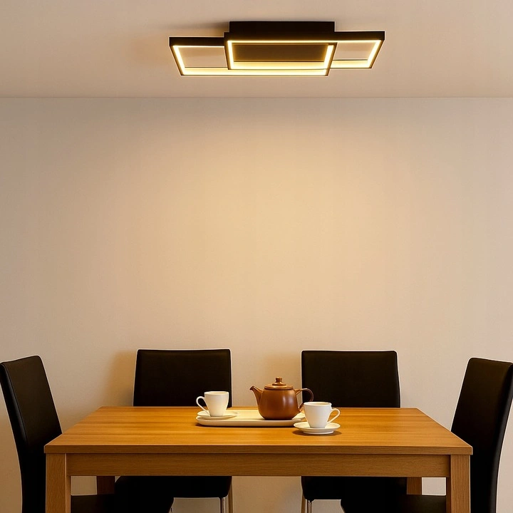 Lampa Sufitowa - Żyrandol LED serii Galaxis w kolorze czarnym łączy w sobie nowoczesność, ciekawy wygląd i prostotę użytkowania. Lampa została wyposażona w zintegrowane źródło światła LED o mocy 45W. Atutem lampy LED jest możliwość zmiany barwy światła oraz ściemniania. Lampą możemy sterować za pomocą dedykowanego pilota. Pilot pozwala nam na zmniejszanie bądź zwiększanie intensywności światła, zmianę jego barwy z ciepłej na neutralną lub zimną oraz włączanie i wyłączanie lampy. Produkt składa się głównie z aluminium (obudowa), tworzywa sztucznego (klosz) i stali (podstawa). Seria Galaxis charakteryzuje się ciekawym designem skierowanym zarówno do miłośników nowoczesnego stylu jak i bardziej uniwersalnego.