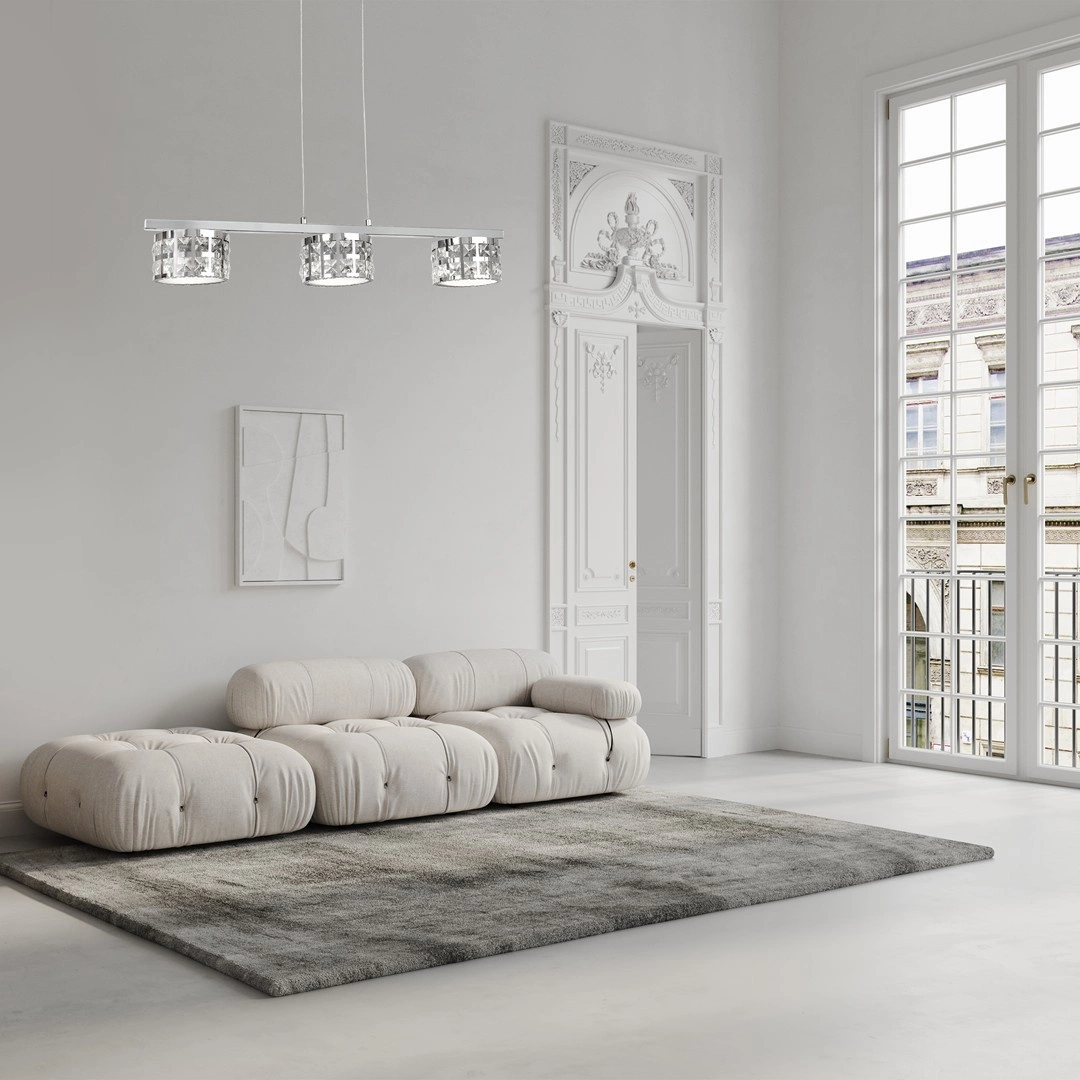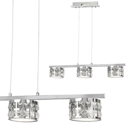 Oprawy lampy wykonano z metalu i pokrytego chromem. Każdą obudowę zdobią kryształki, które sprawiają, że lampa będzie idealna na przykład w salonie urządzonym w stylu glamour. Dzięki regulowanym linkom lampę ALEX ML367 można zawiesić na wysokości od 30 cm do 70 cm od sufitu. Aby stworzyć jednolita aranżację pomieszczenia, dobierz do tego modelu także inne lampy z tej serii: lampkę nocną (ALEX 173) oraz kinkiet (ALEX 172).