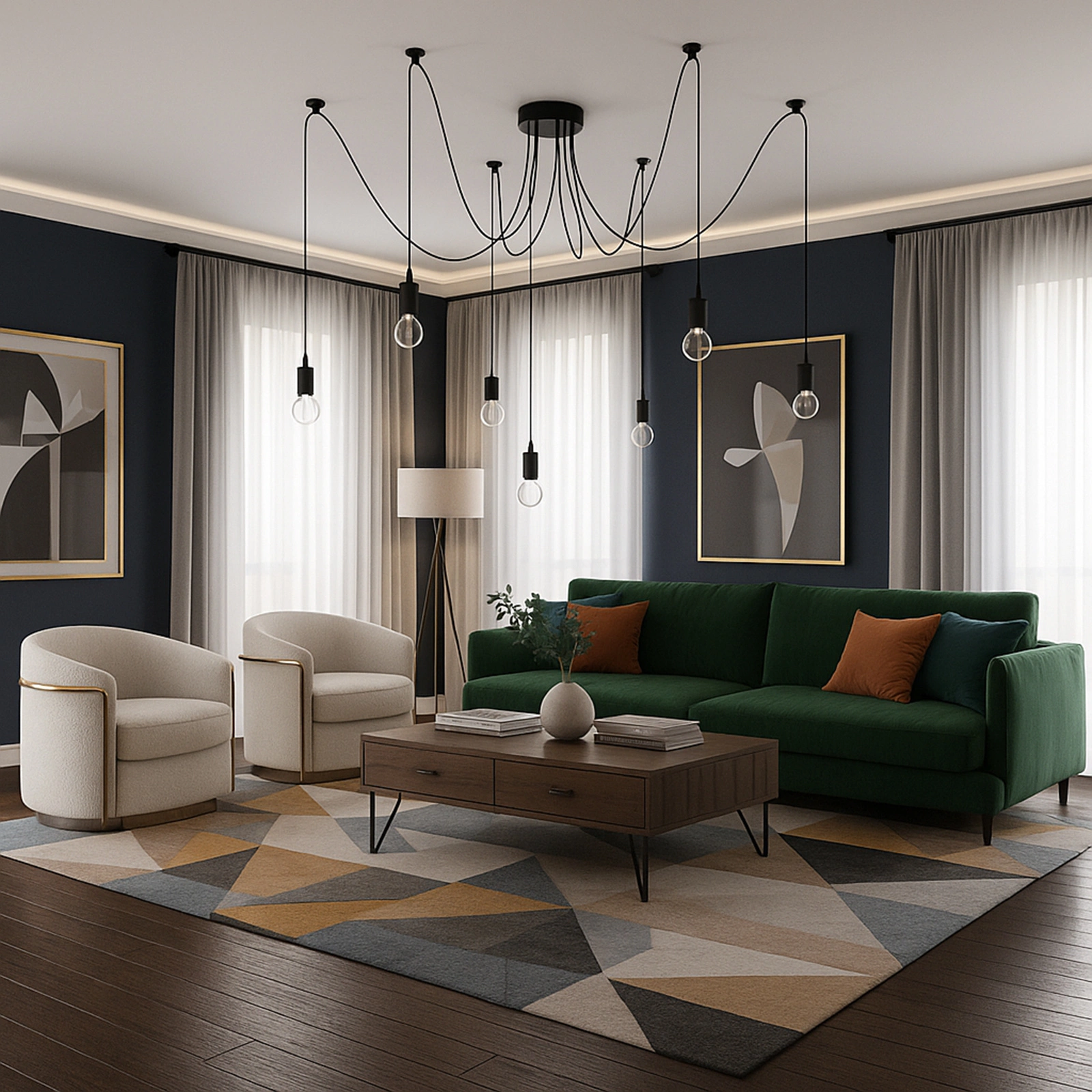 - Elastyczna forma – regulowane przewody pozwalają ułożyć lampę dokładnie tak, jak potrzebujesz, dzięki czemu łatwo dopasujesz ją do układu i wysokości pomieszczenia, tworząc efektowną i spójną aranżację.